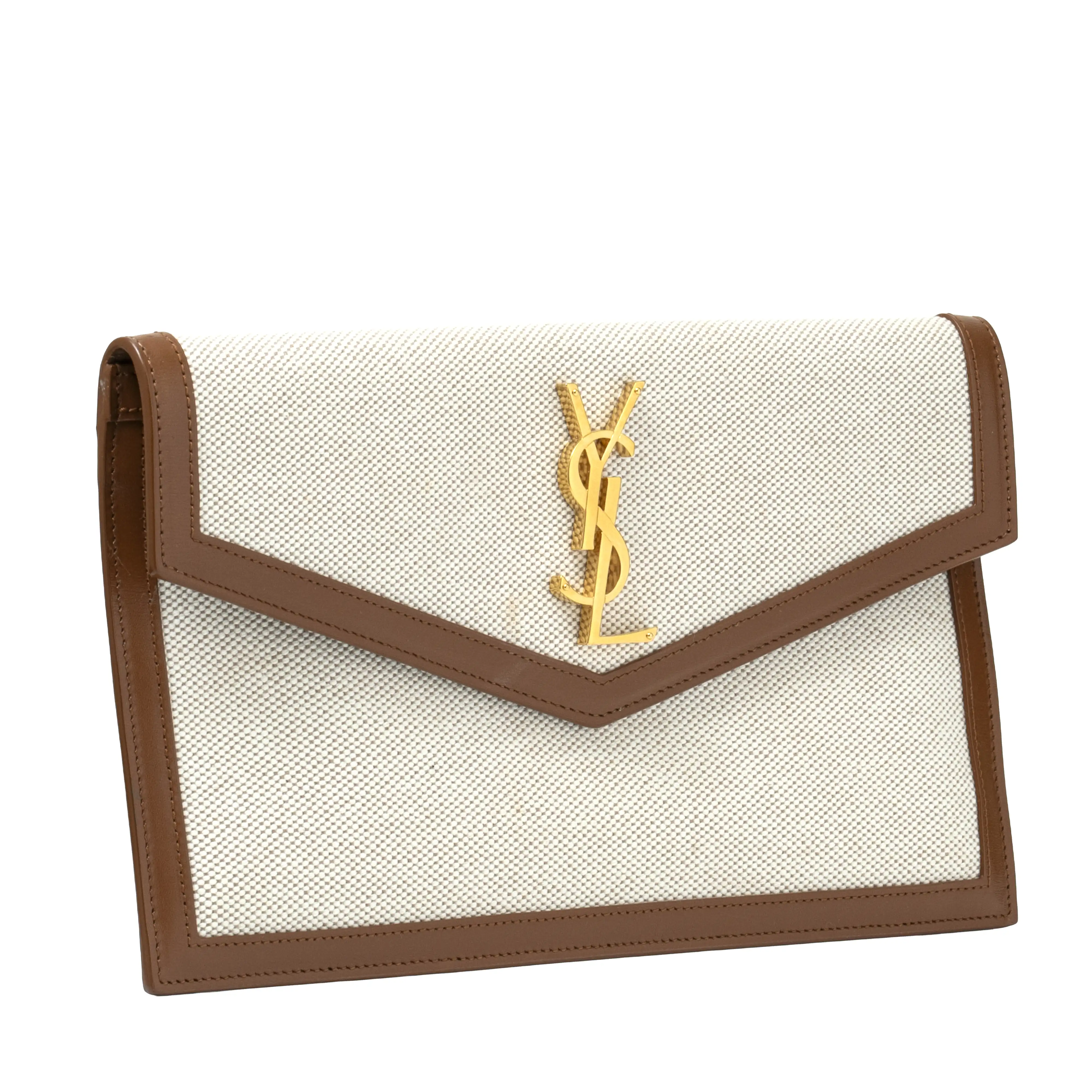 An Yves Saint Laurent Uptown Pouch in canvas with brown leather trim. Includes maker's dust bag and box.