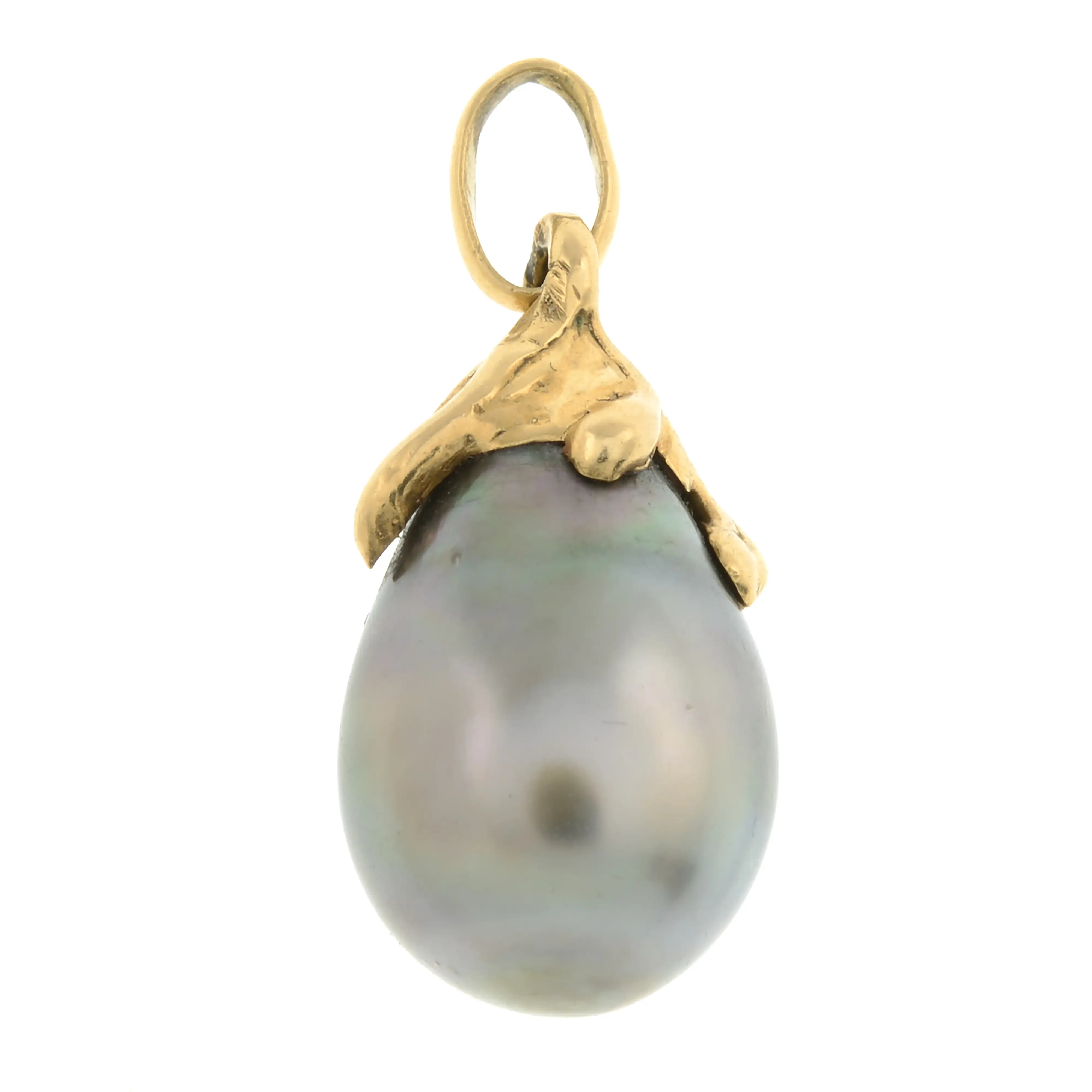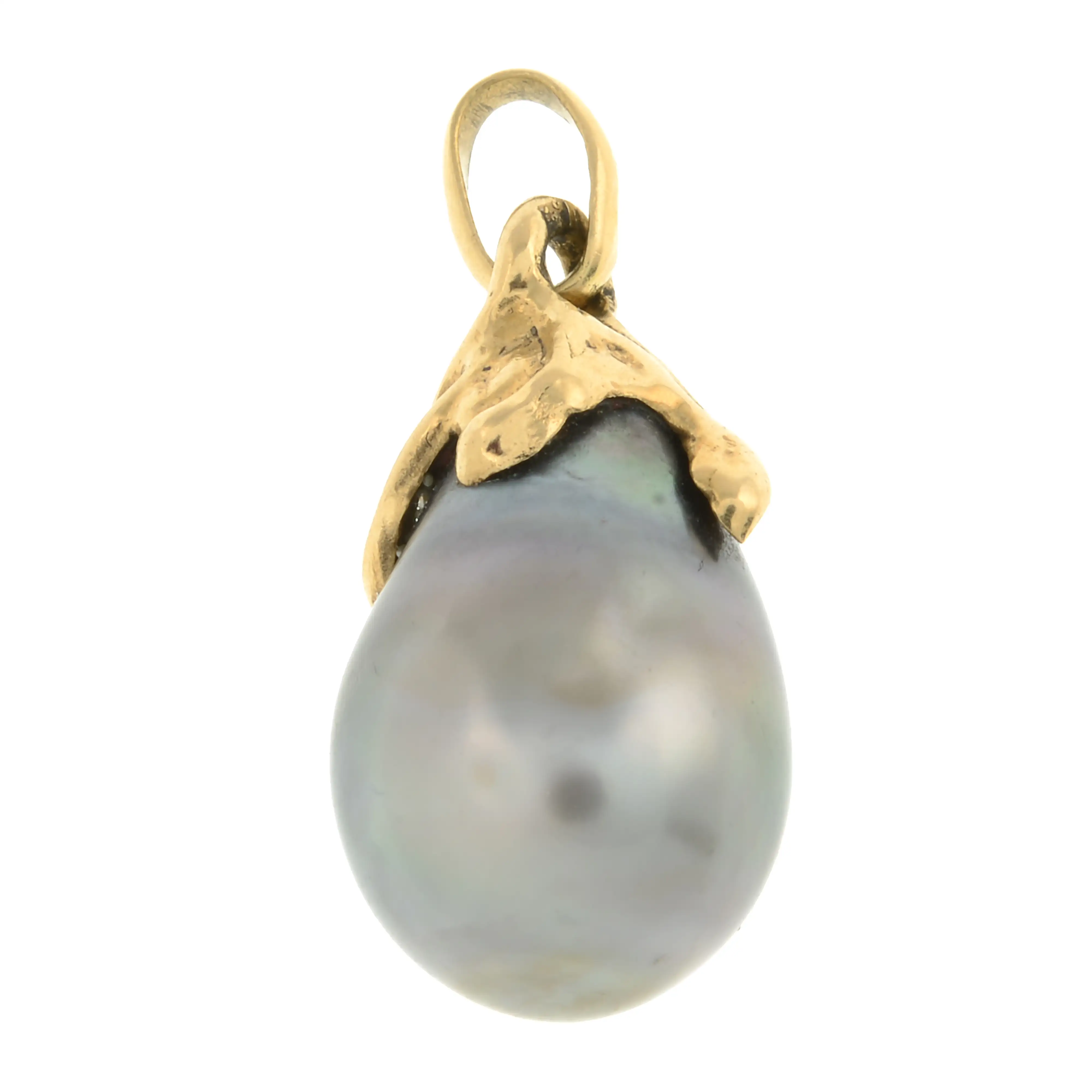 Cultured pearl grey and brown body colour, with green, blue and pink overtones, typical surface blemishes and light nacre damage.