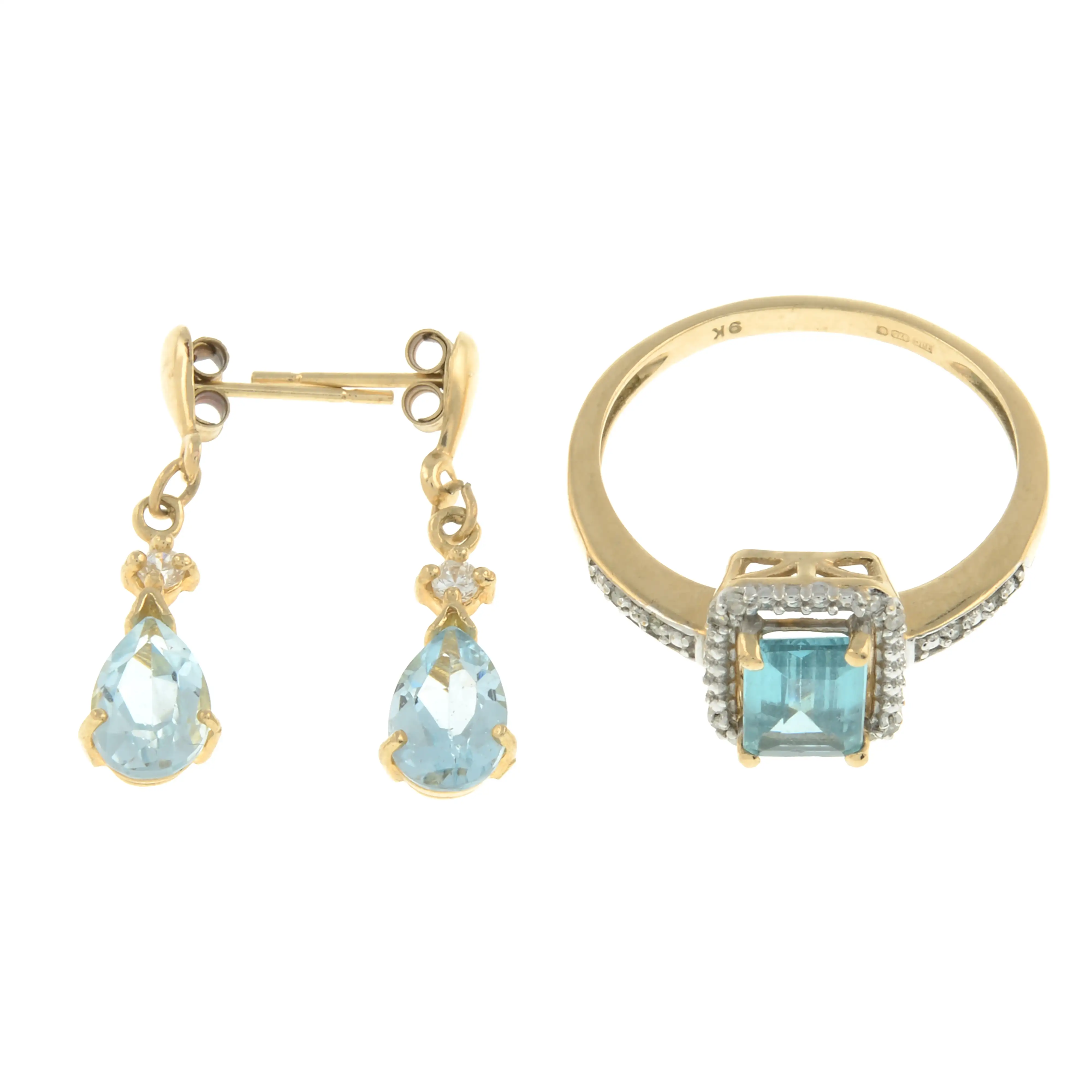 A pair of topaz and diamond drop earrings, length 2.4cm, 1.2gm.