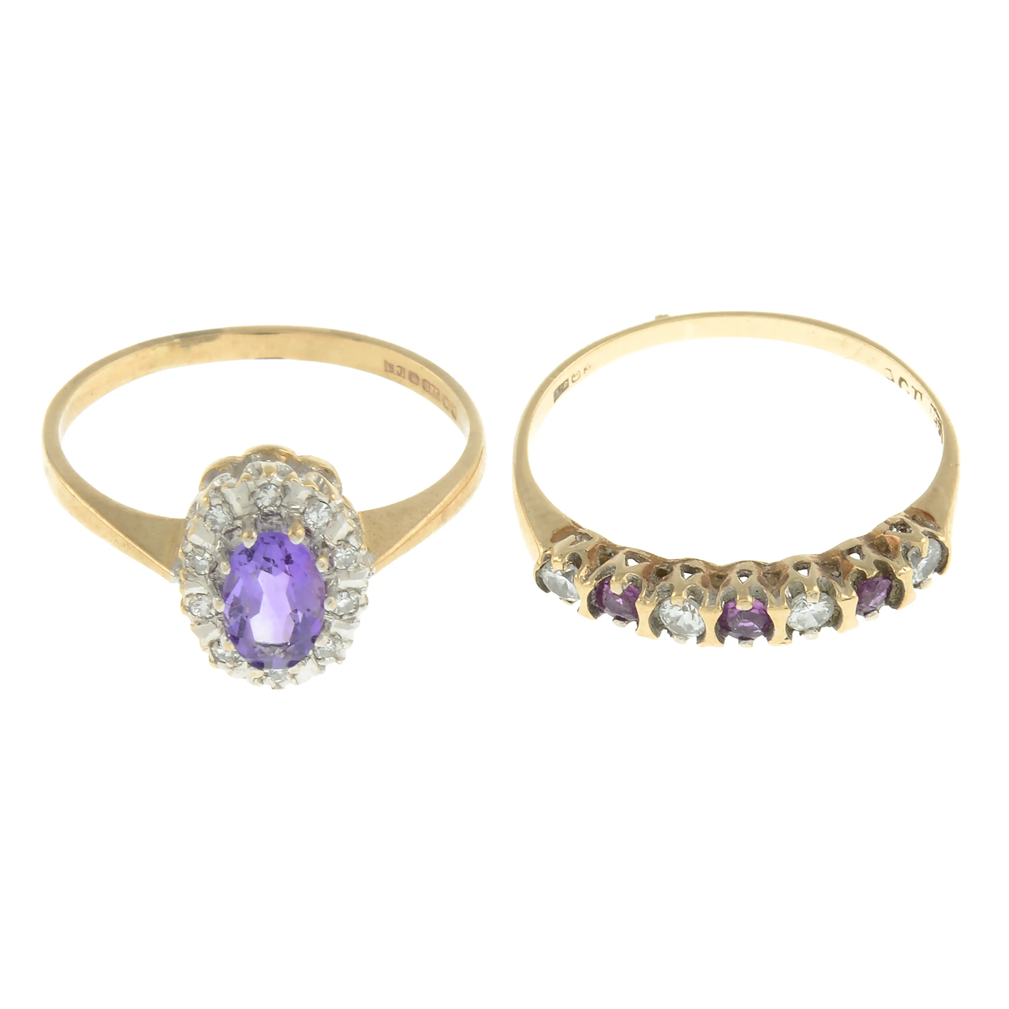 A 9ct gold amethyst and colourless gem cluster ring, hallmarks for London, 1991, ring size K1/2, 1.5gm.