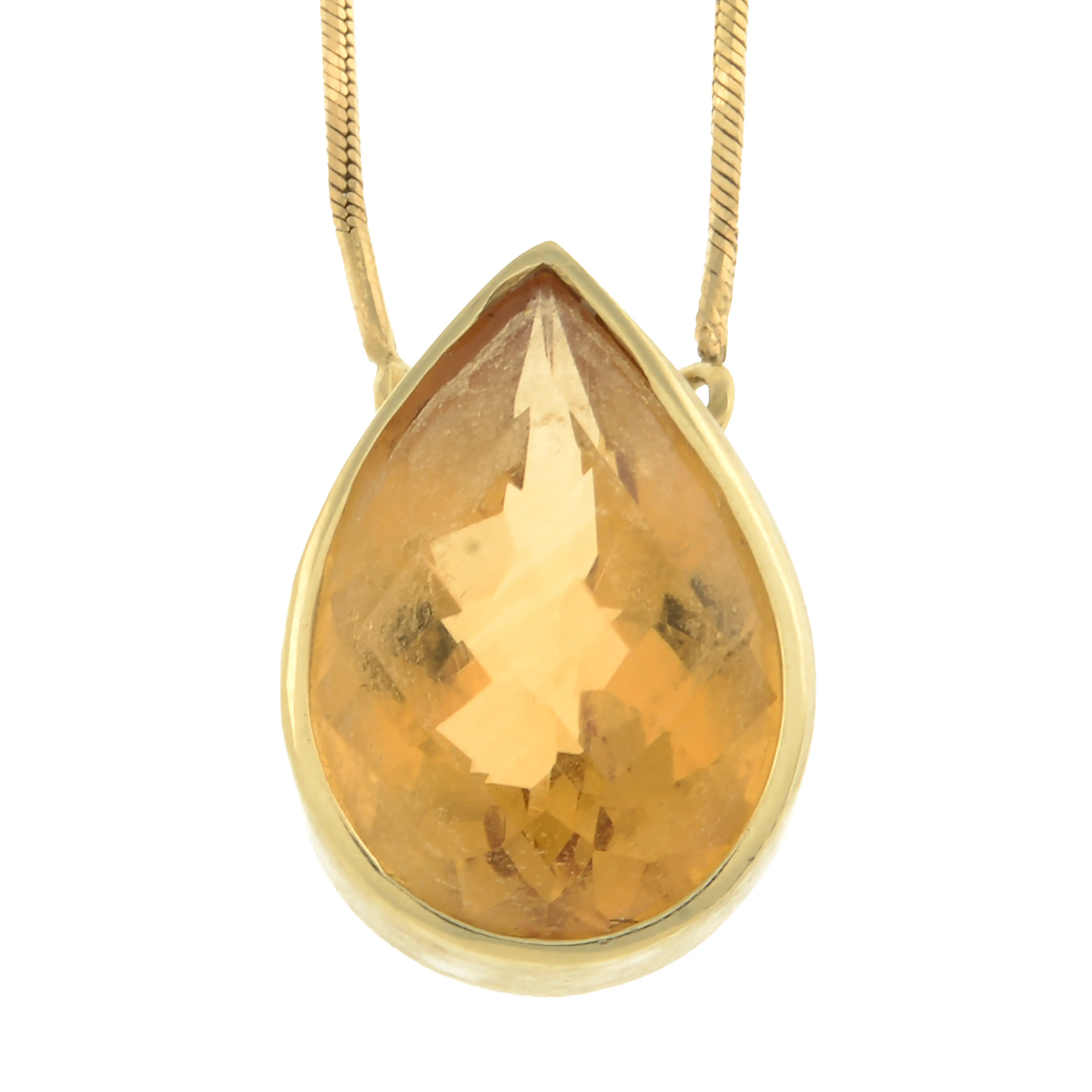 Citrine appears medium yellow, well saturated, with some surface scratches.