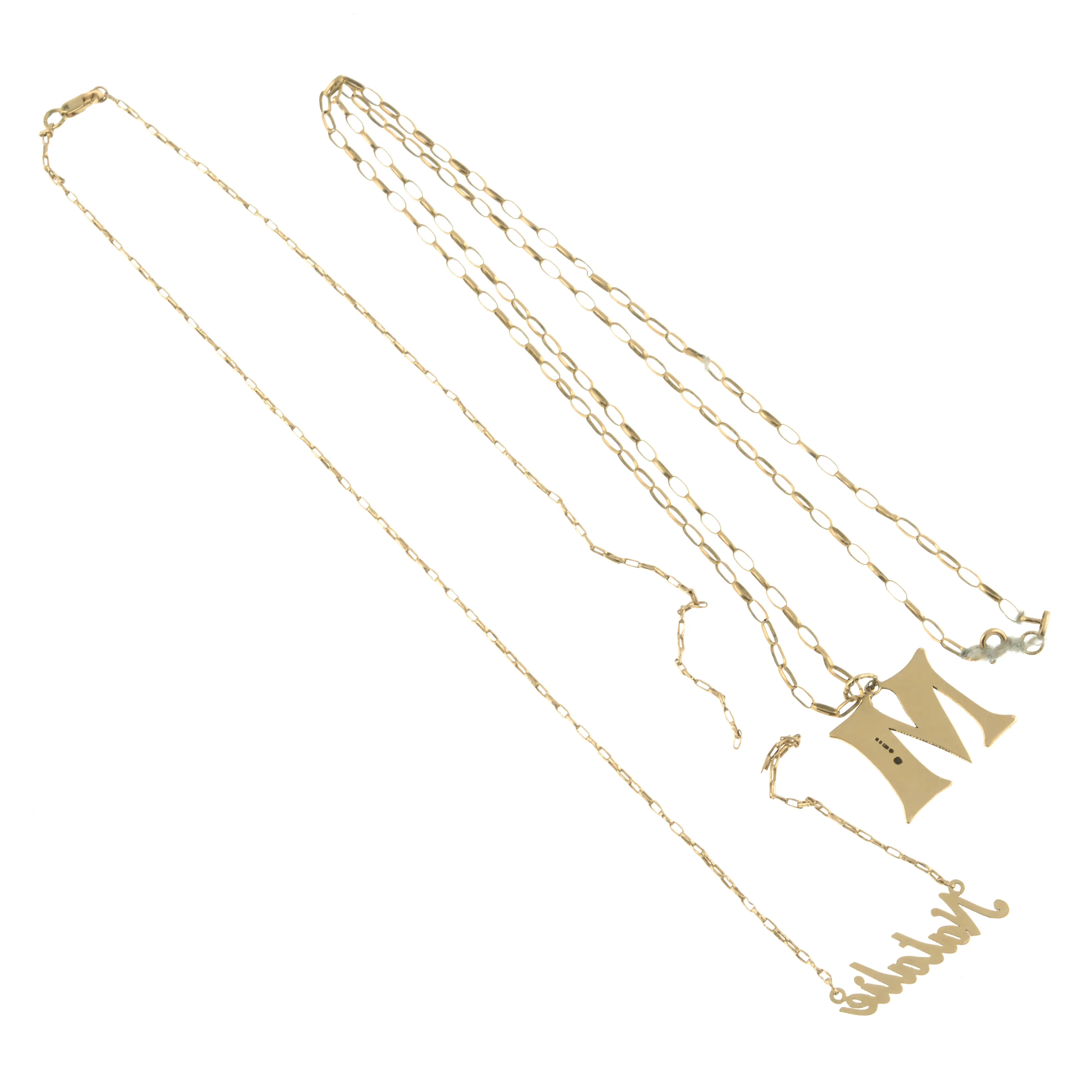 (77760) One chain stamped 375 to clasp, one chain stamped 9K to clasp, indistinct.