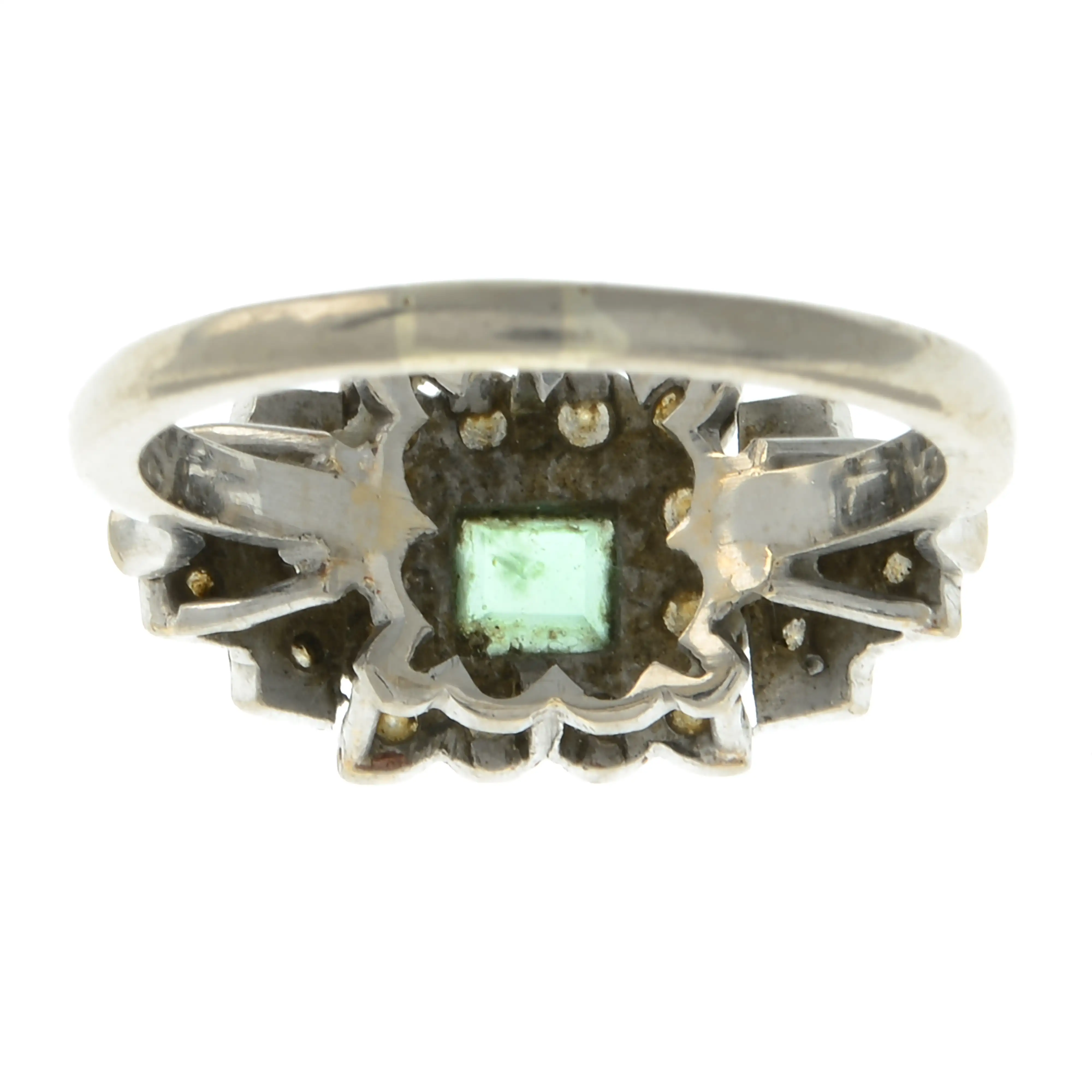 Emerald appears light slightly blueish-green, with some minor nicks/nibbles to facet edges.