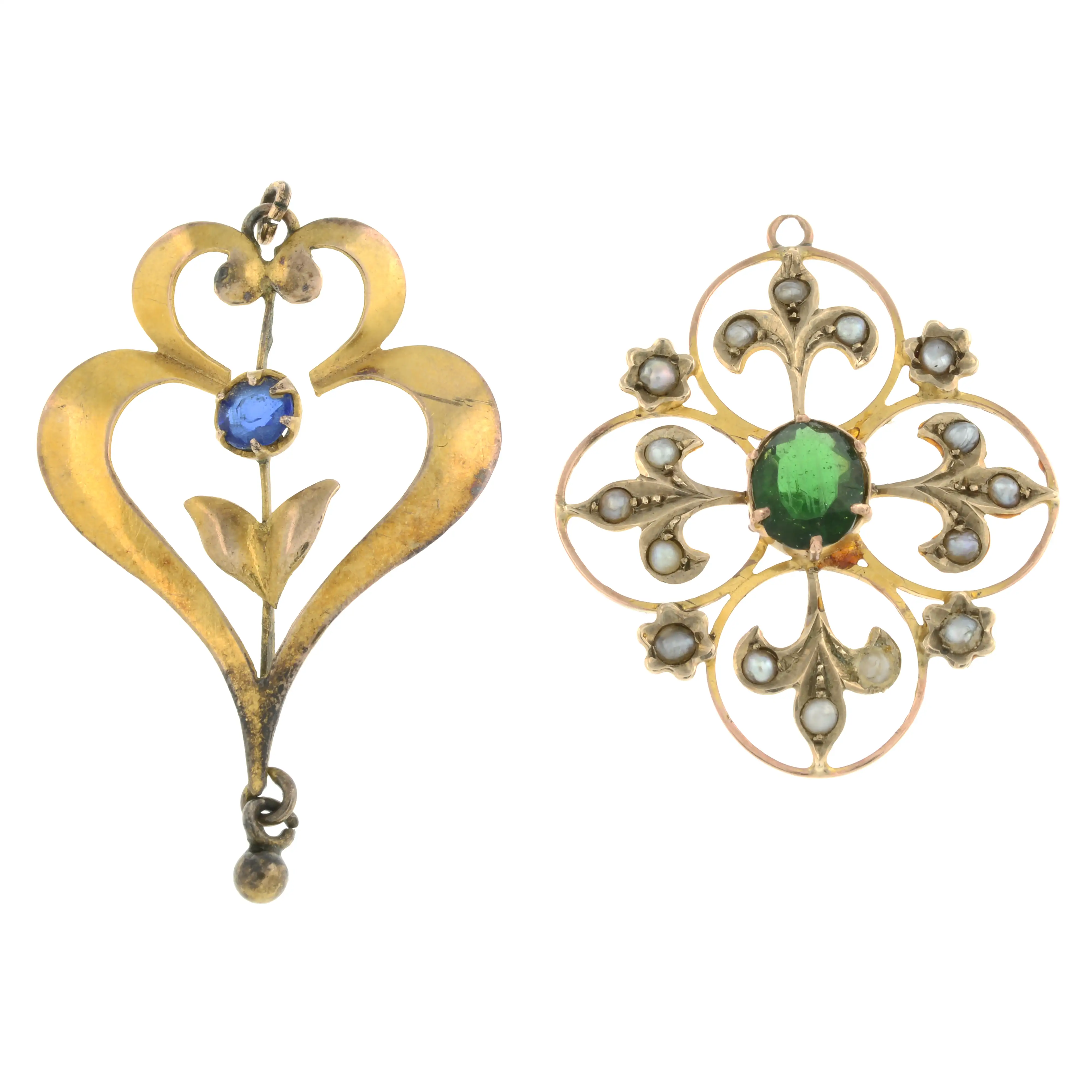 Split pearls with typical surface blemishes and light to some nacre damage.