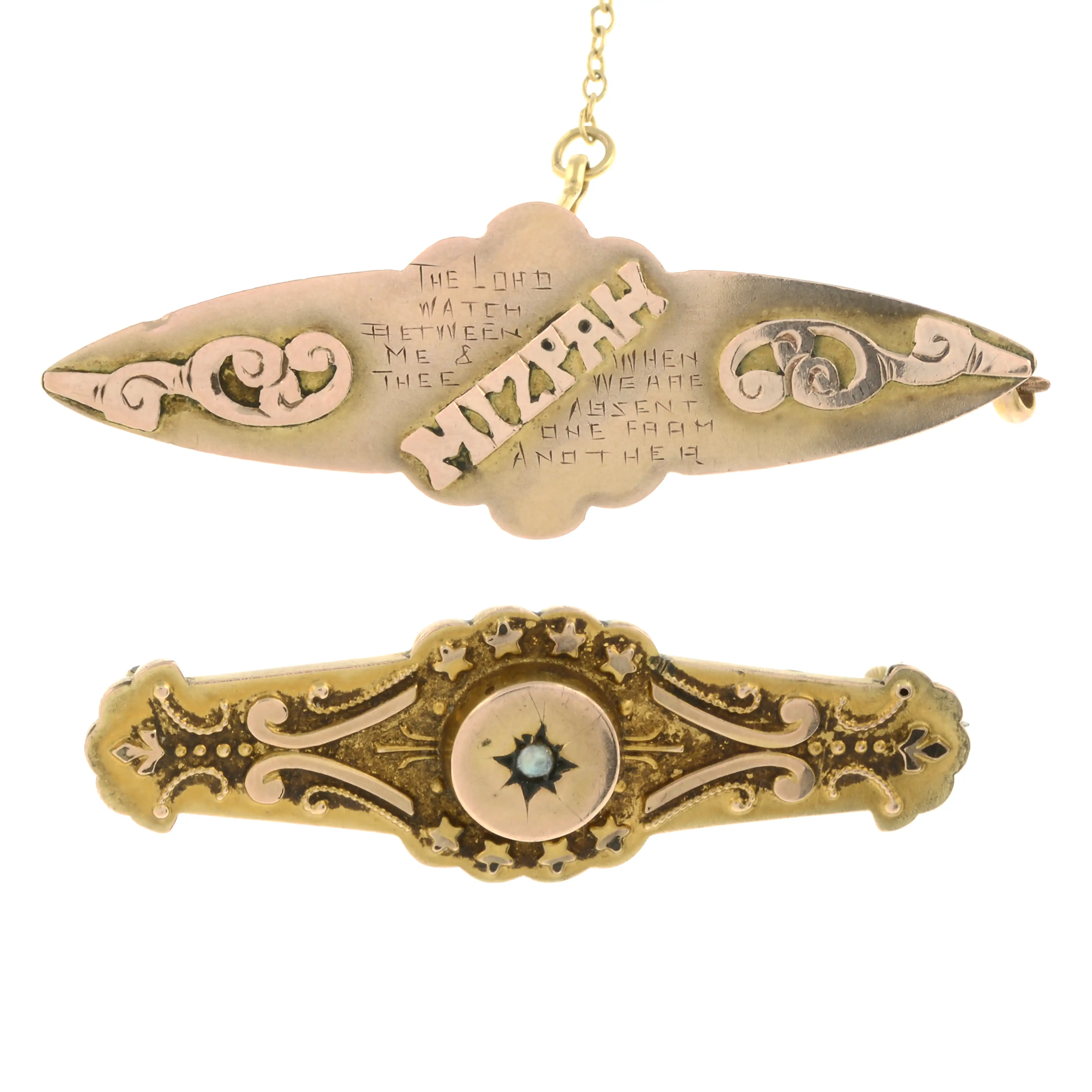 An early 20th century 'Mizpah' brooch, stamped 9CT, length 4.2cm, 2.3gm.