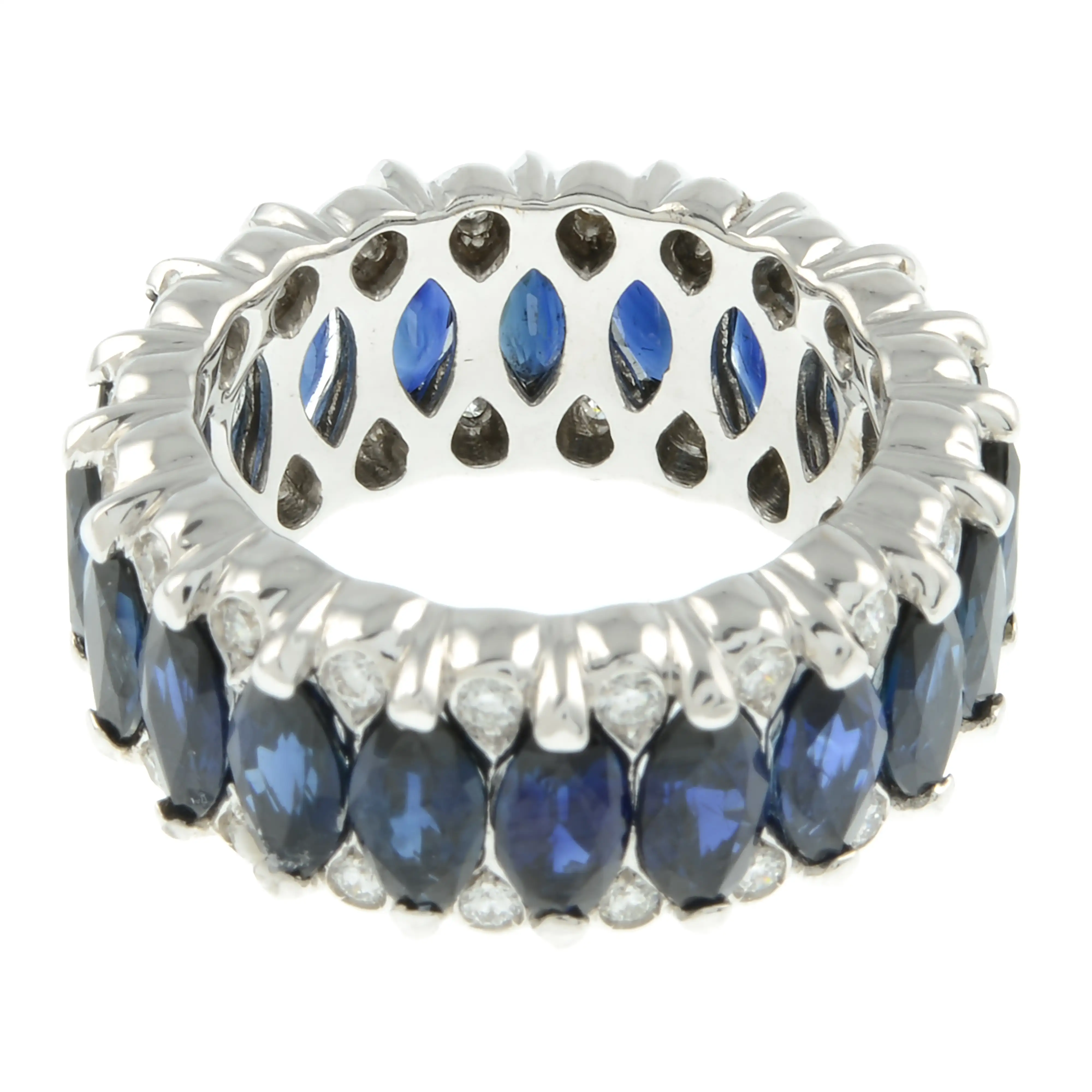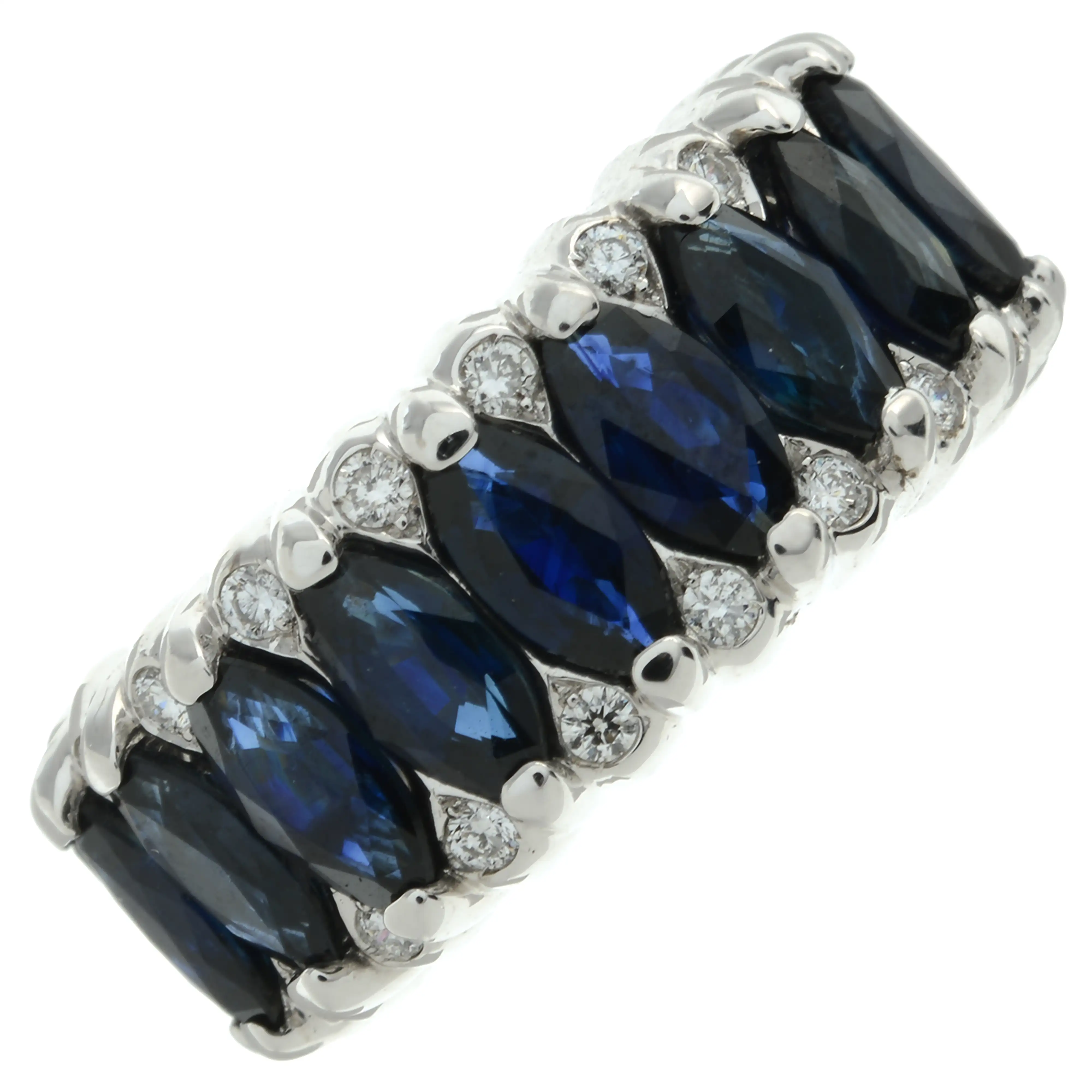 Sapphires appear dark blue, well saturated, with some minor nicks/nibbles.