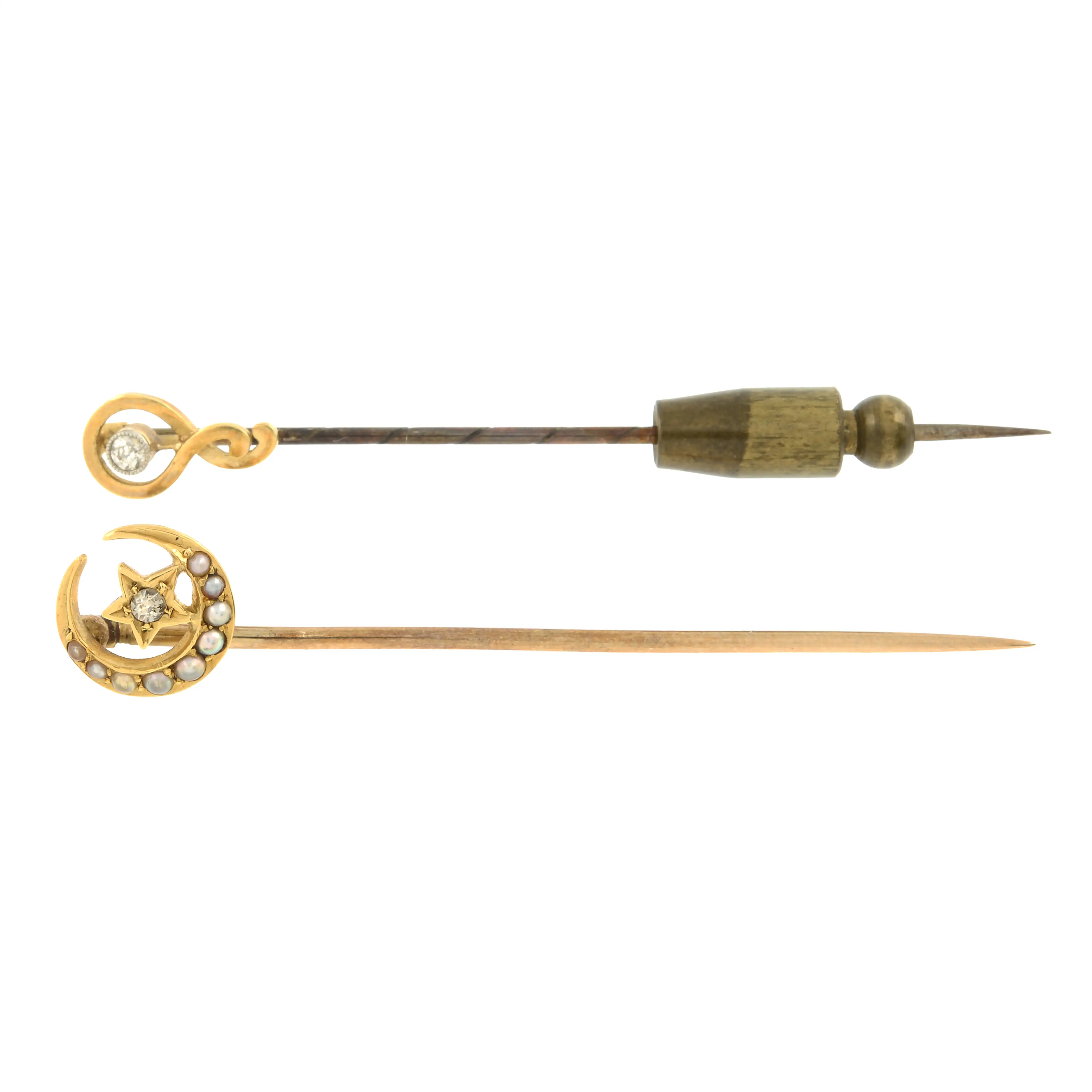 An early 20th century old-cut diamond and split pearl crescent and star stickpin, stamped 18ct, length of stickpin head 1cm, 1.8gm.