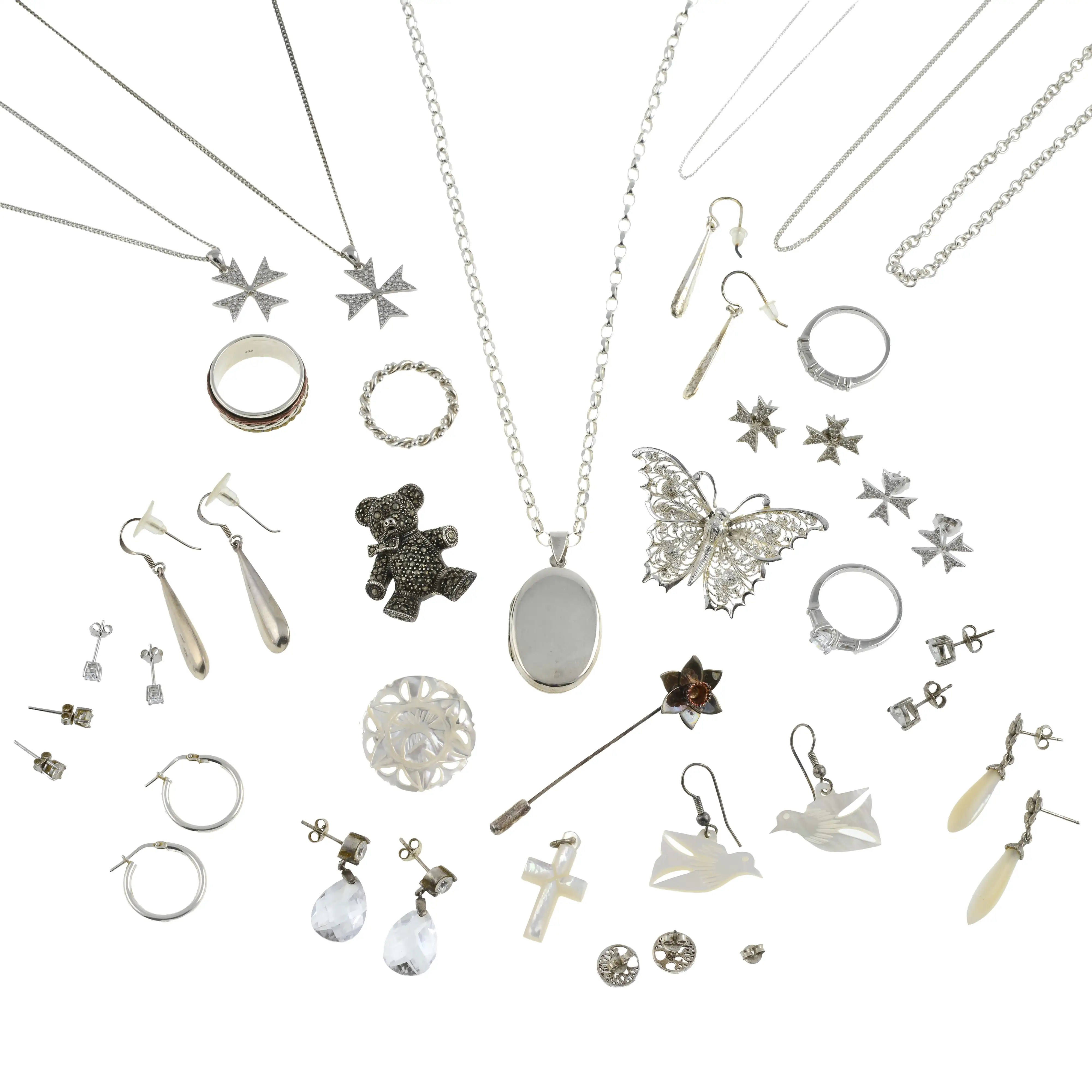To include mostly white metal pendants, chains, brooches and earrings.