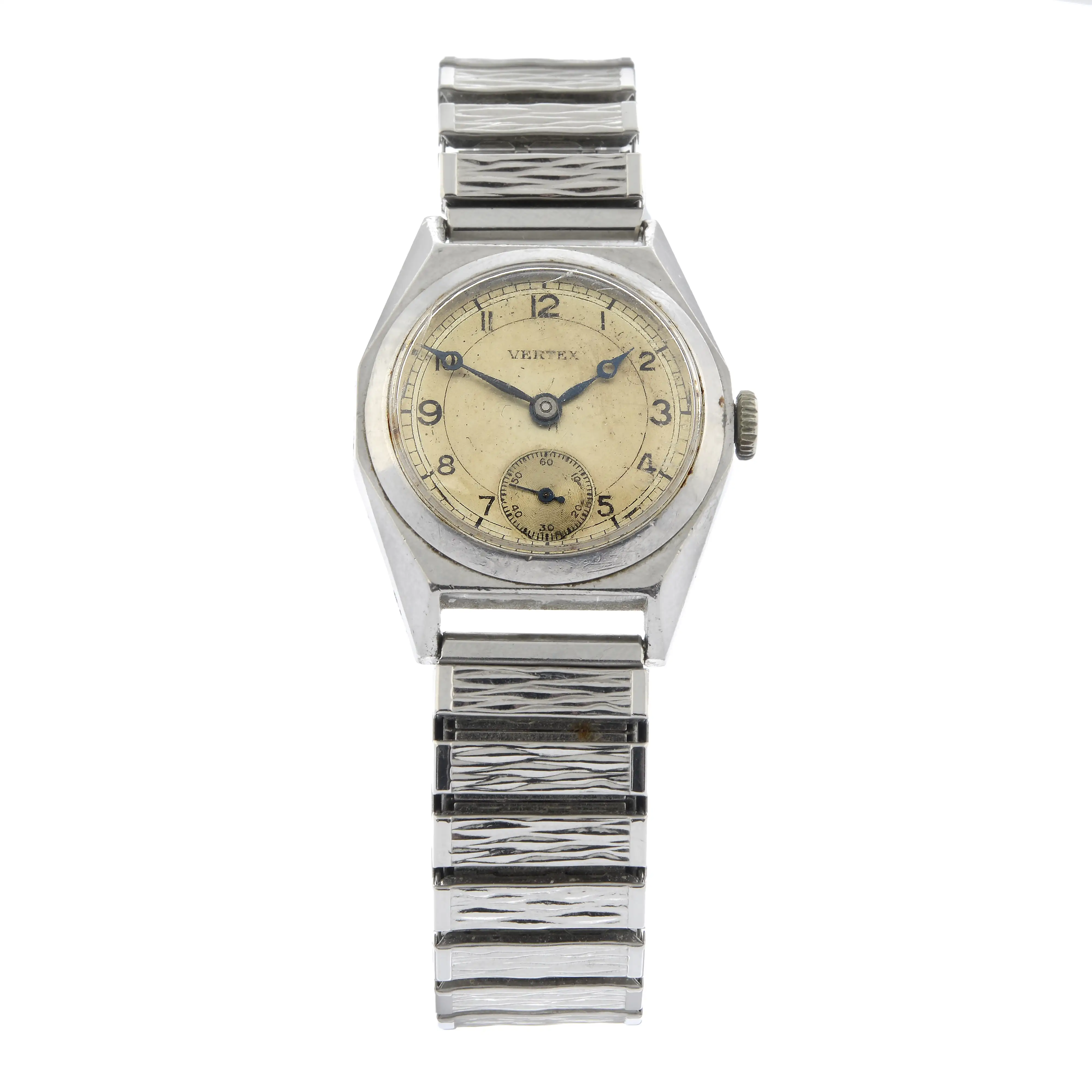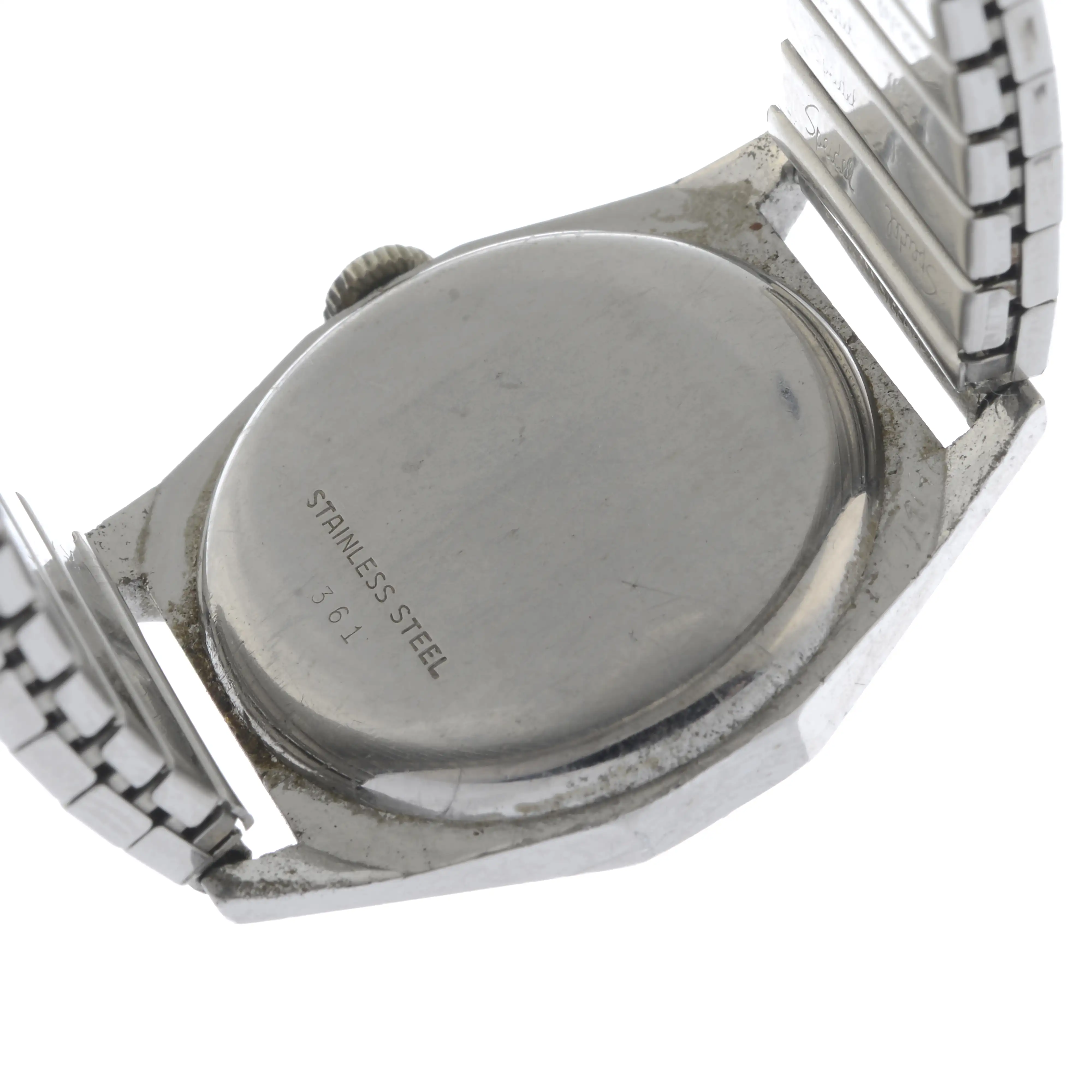 Stainless steel case. Signed manual wind movement. Silvered dial. On an unsigned stainless steel expandable bracelet.
