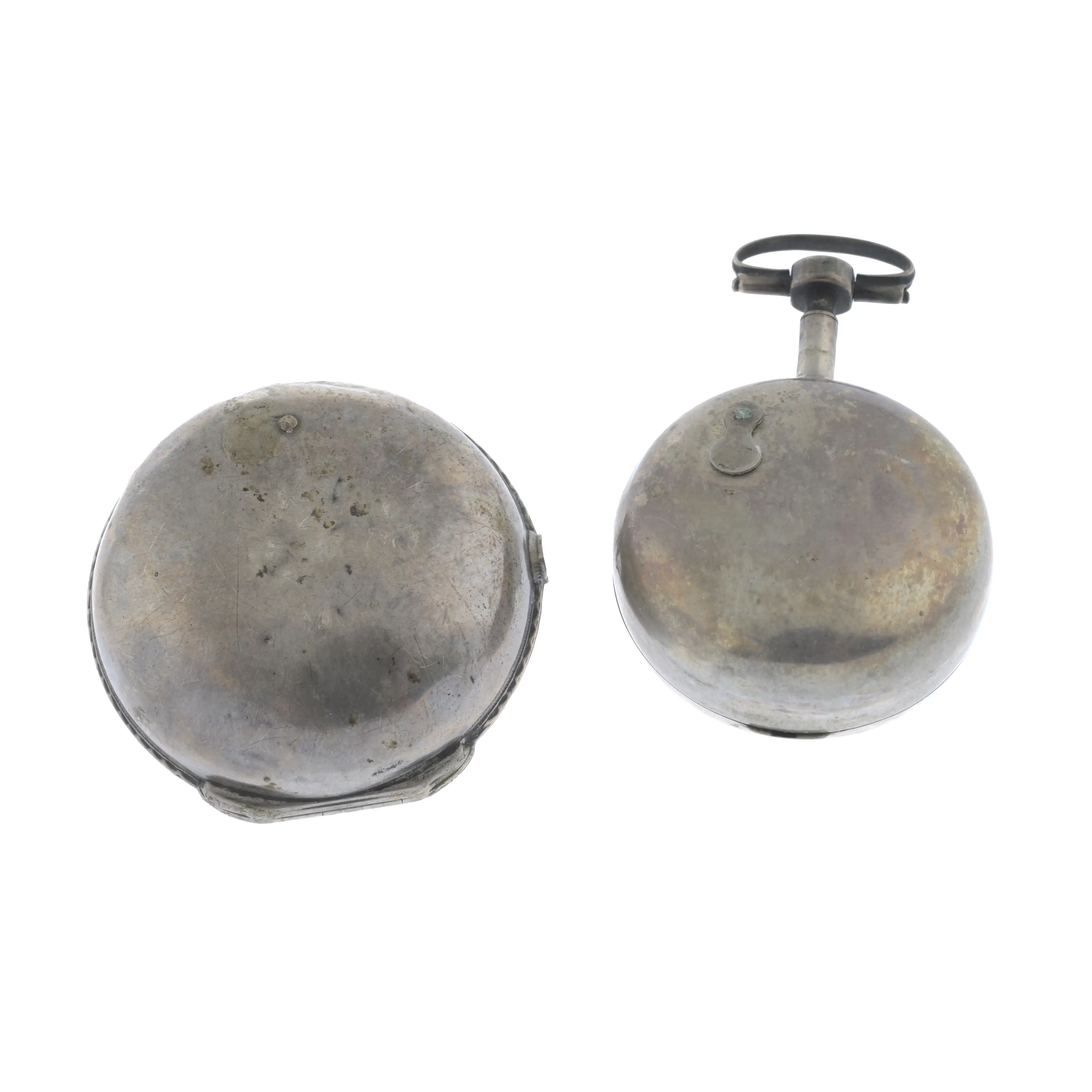 White metal cases. Signed key wind full plate fusee and chain movement with verge escapement, baluster pillars and pierced balance cock. White dial with painted scene to the centre.