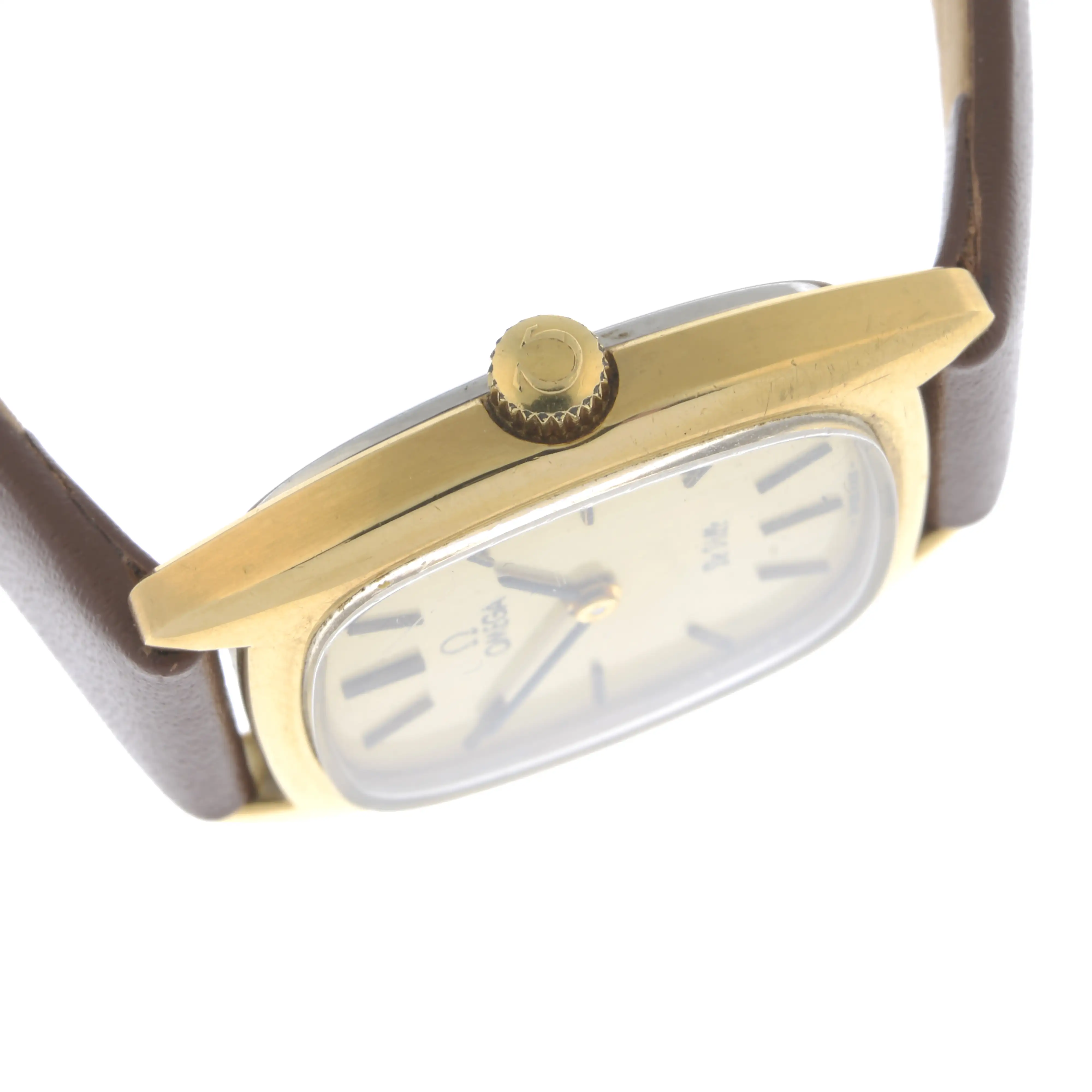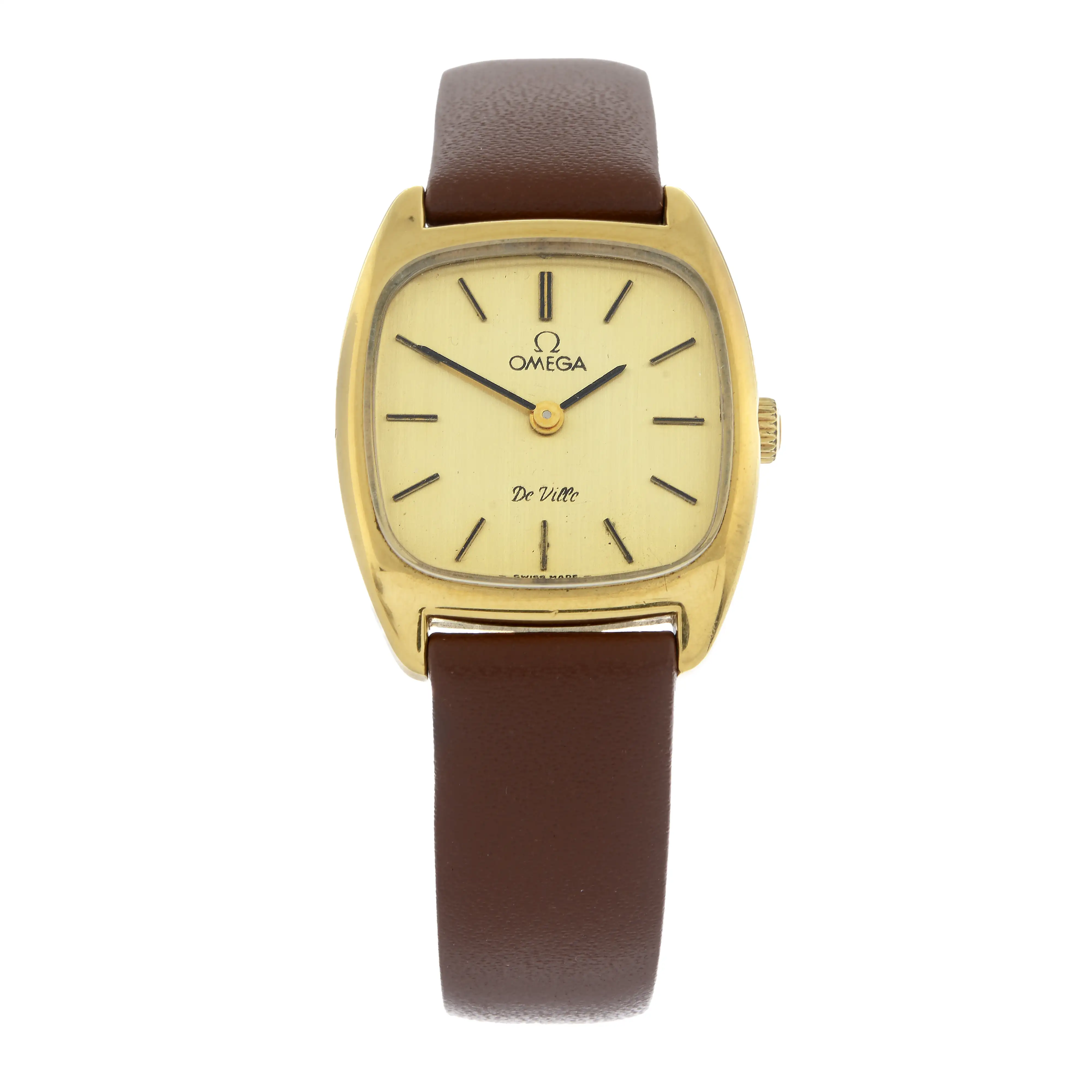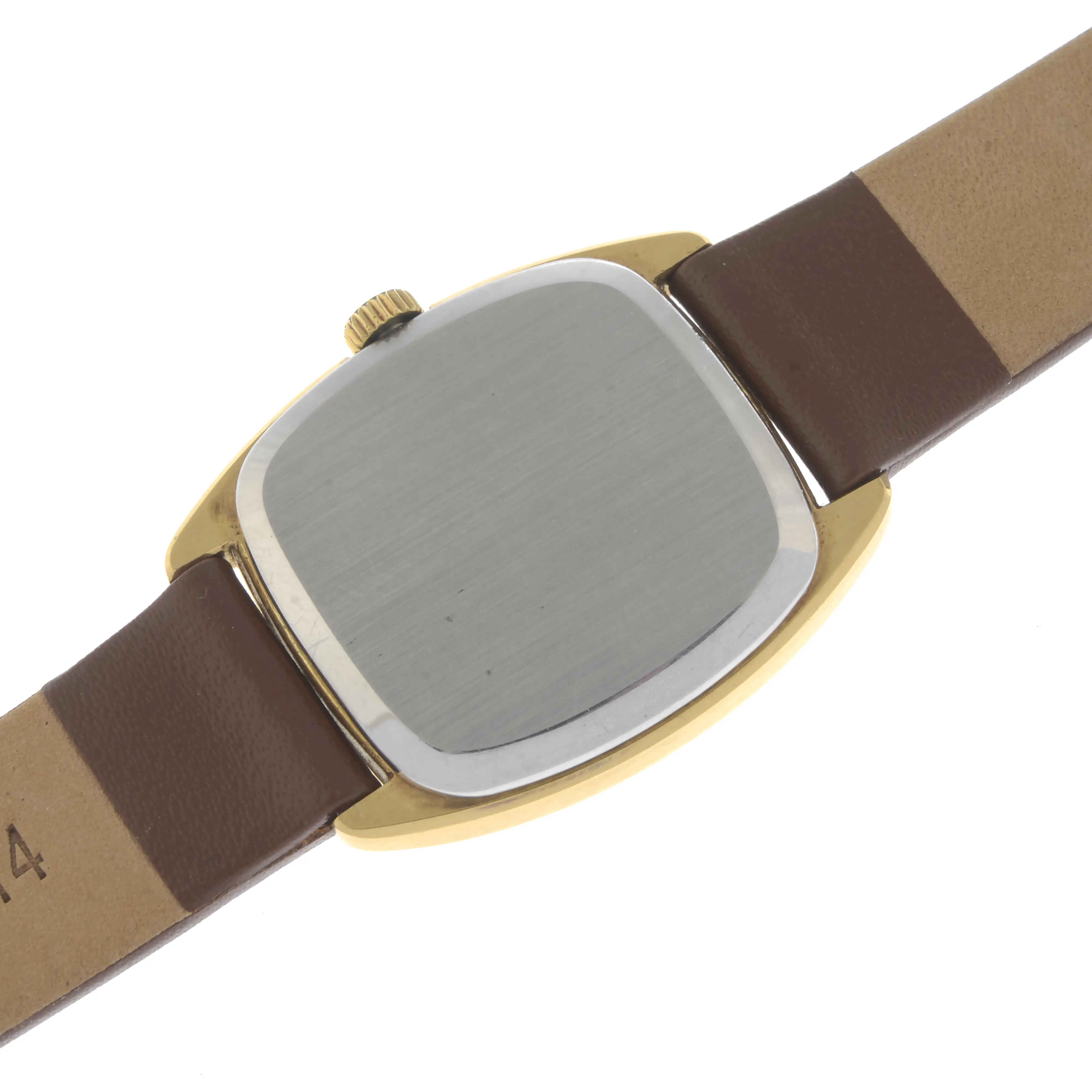 Gold plated case with stainless steel case back. Signed manual wind calibre 625, numbered 43324001. Champagne dial. On a brown leather strap with signed gold plated pin buckle.