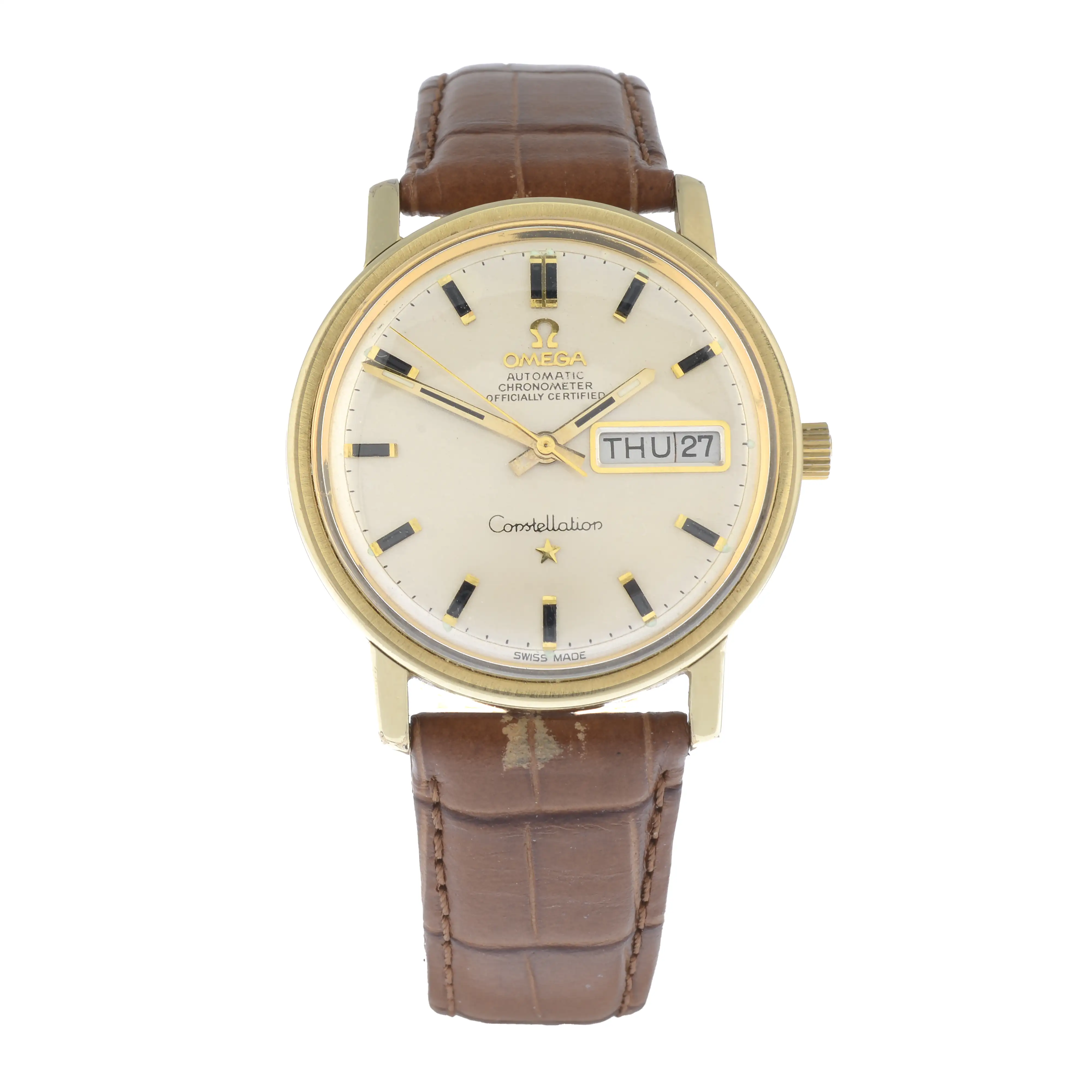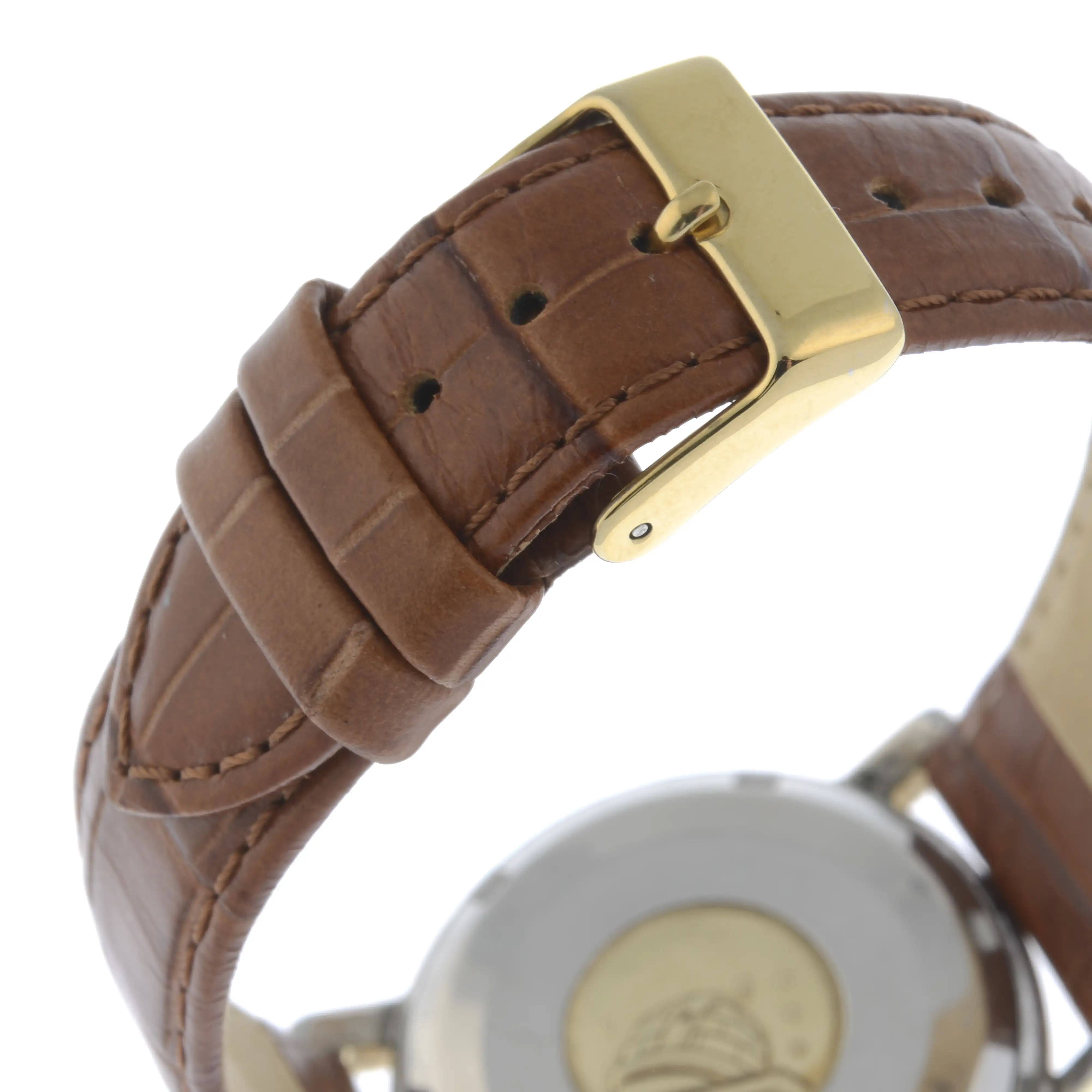 Gold plated case with stainless steel case back. Signed automatic calibre 751, numbered 31218542. Silvered dial. On an unsigned brown leather strap with gold plated pin buckle.