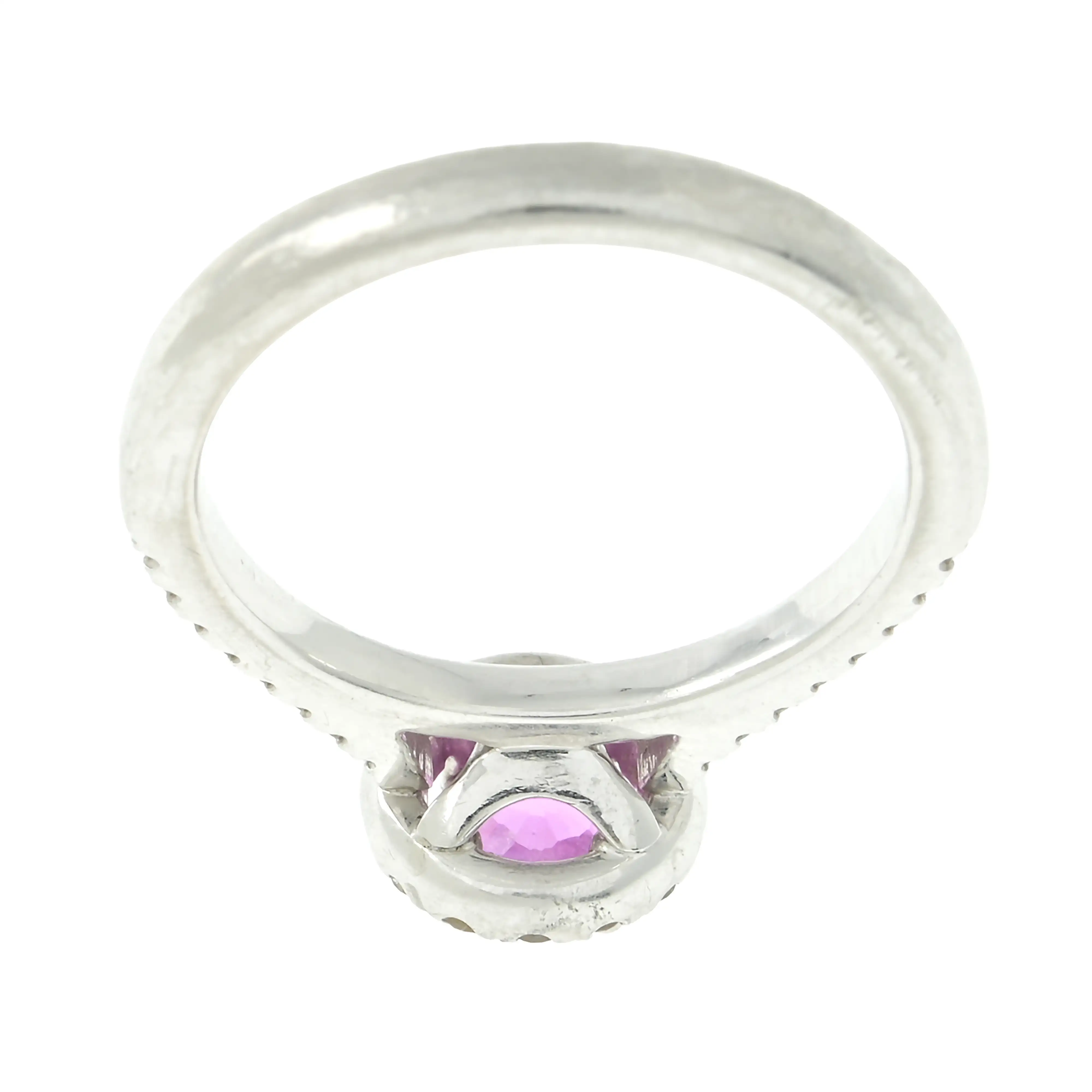 Sapphire appears light-medium pink, well saturated, with some minor abrasions to facet edges.