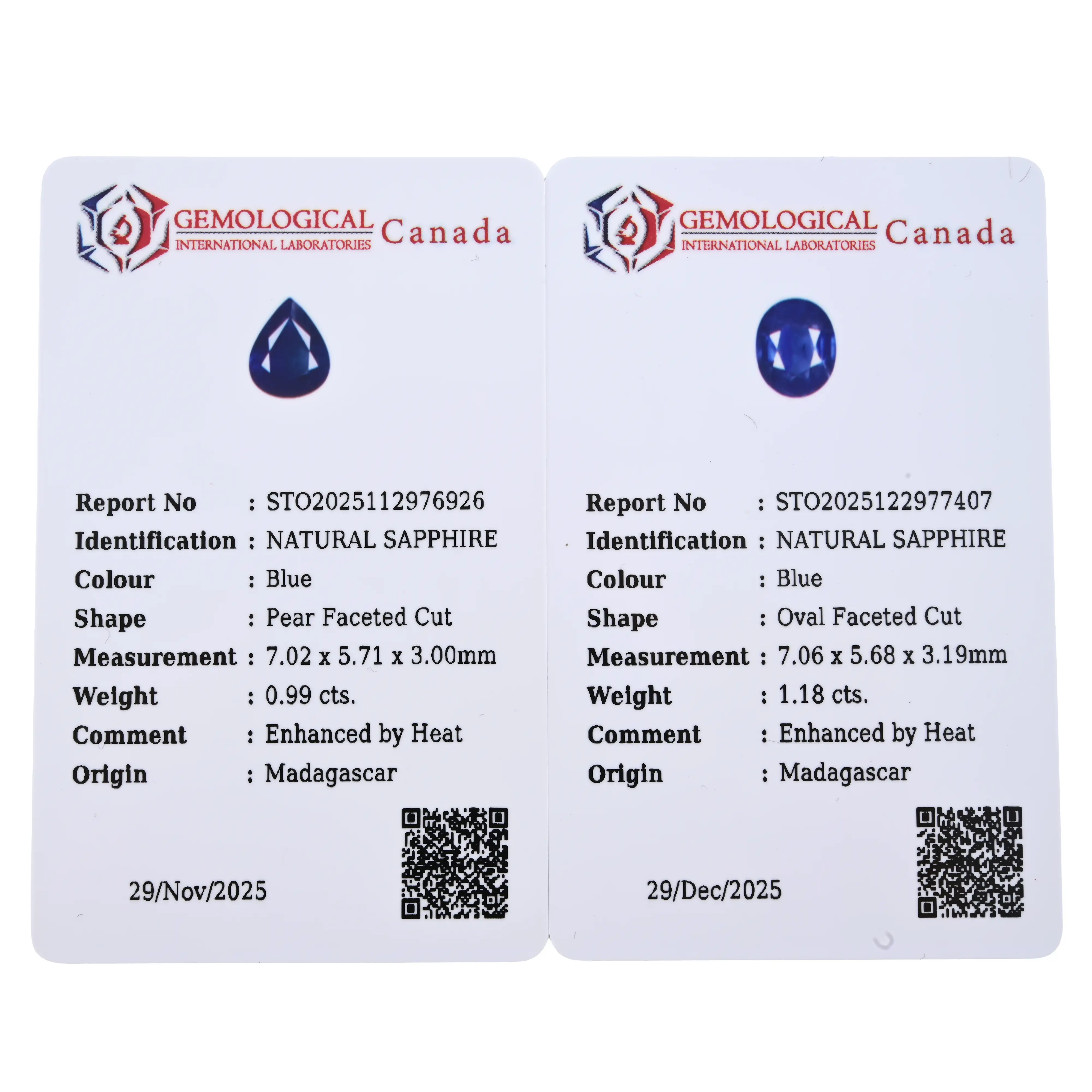 The pear shape, weight 0.99ct, accompanied by ID card number STO2025112976926, by Gemological International Laboratories, dated 29th November 2025, stating that the sapphire is natural and has been enhanced by heat, of Madagascar origin and measuring approximately 7.02 by 5.71 by 3.00mm.