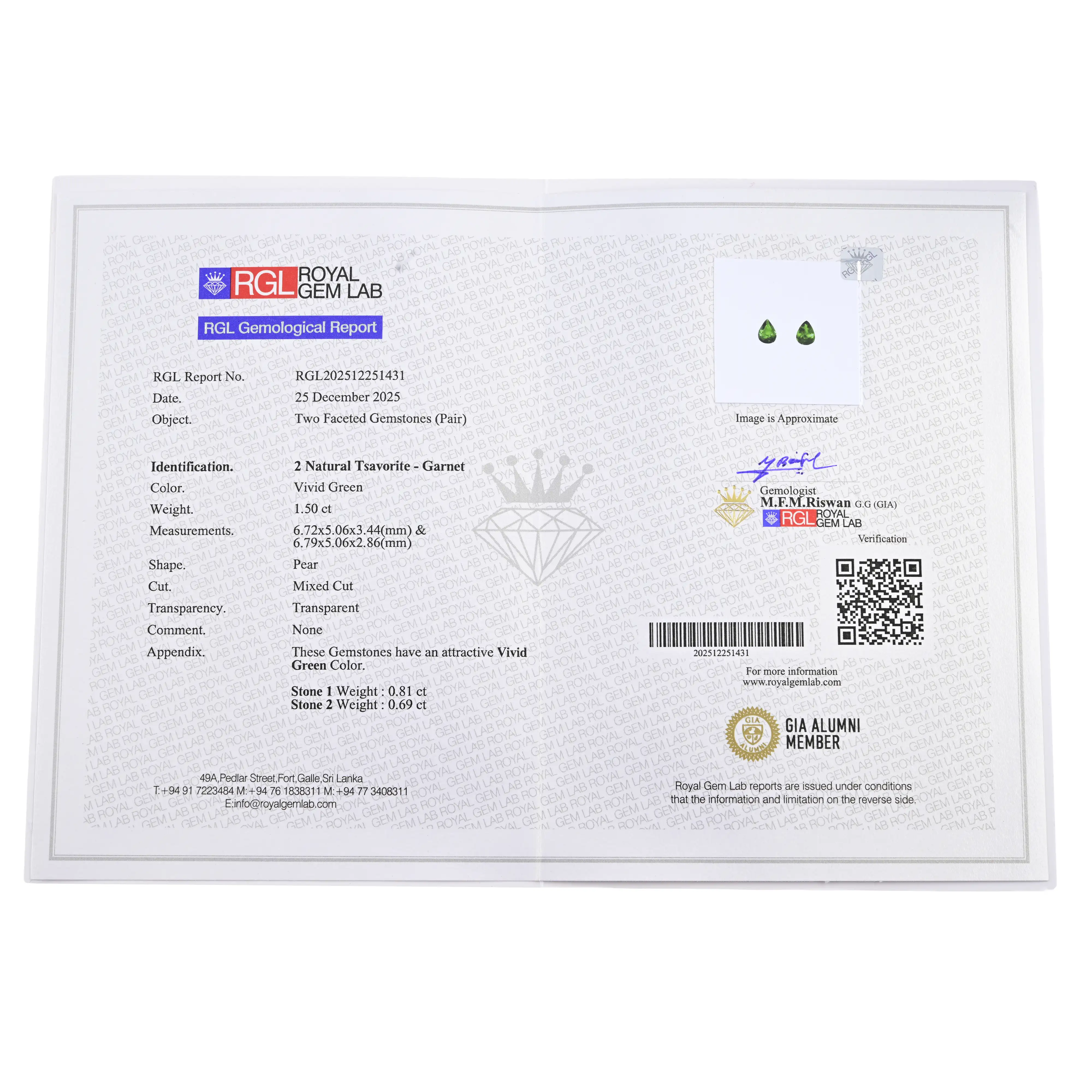 Accompanied by Gem Report no. RGL202512251431, by RGL, dated 25th December 2025, stating that the two tsavorite garnets are natural, with the largest weighing 0.81ct and measuring 6.72 by 5.06 by 3.44mm, and the other, weighing 0.69ct and measuring 6.79 by 5.06 by 2.86mm.