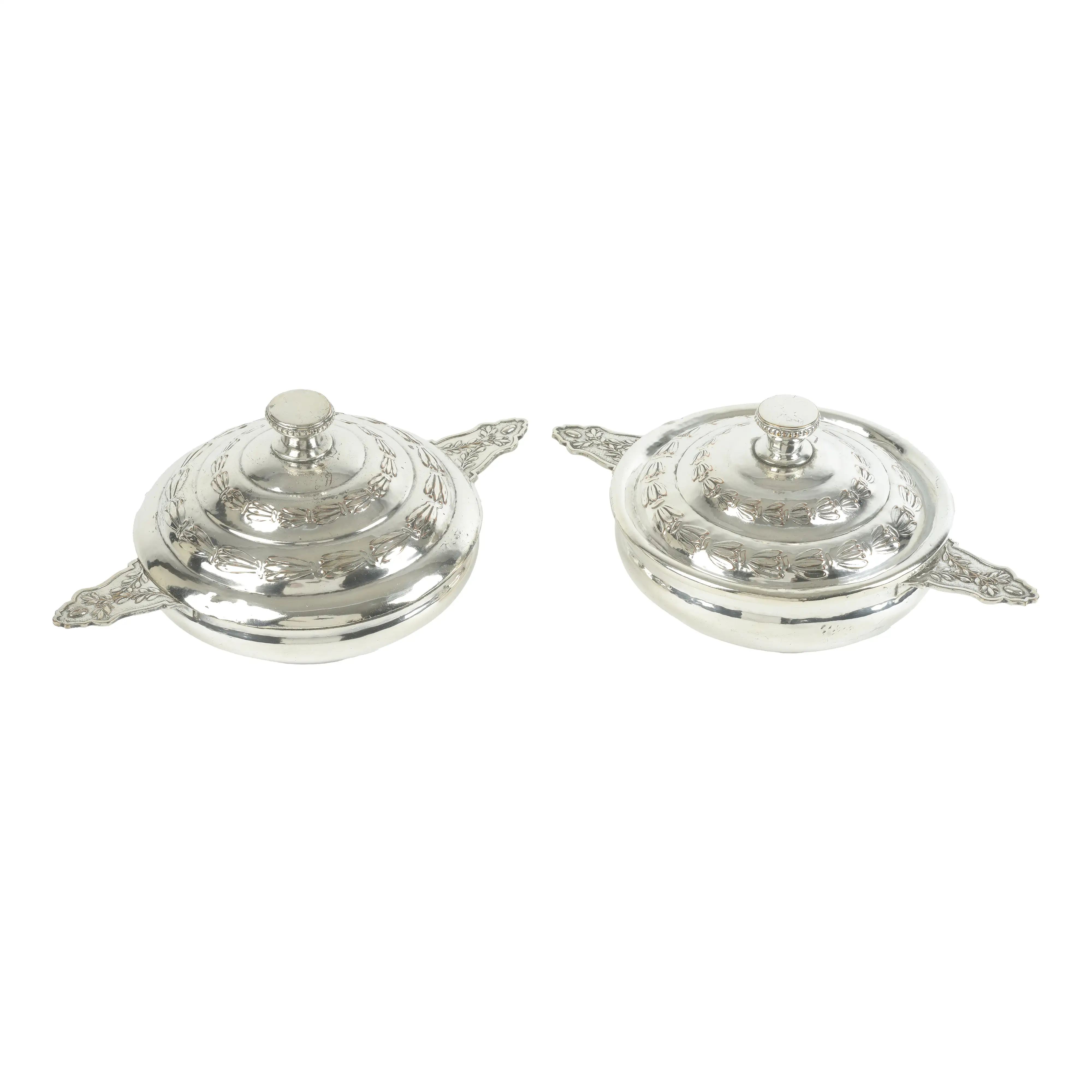 Duchess of Sutherland Cripples Guild, two silver plated on copper porringers and covers, each of similar, circular, squat form having twin handles decorated with olive branches, and slightly domed cover embossed with leaf and berry borders. Both stamped to base with the Guild mark of D.S.C.G under a ducal coronet. Approximate rim diameter 16cm, and maximum length across handles 27.5cm. (2).