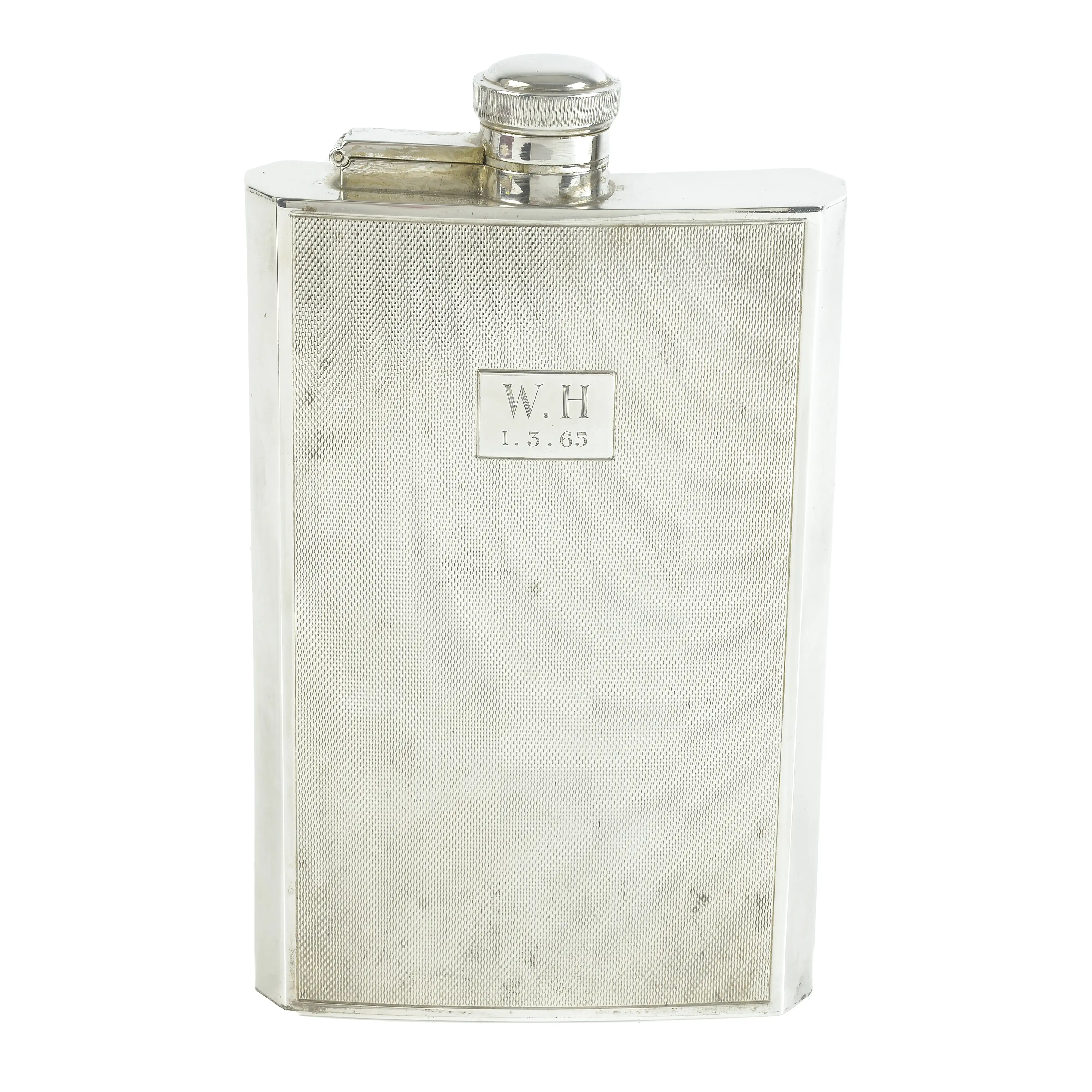 A mid-20th century silver hip flask, of curved rectangular form with engine-turned decoration and panelled sides, and initial and date engraved cartouche to the front, with bayonet closure lid on hinged arm. Hallmarked James Dixon & Sons Ltd., Sheffield, probably 1963. Maximum height 17cm, length across base 10cm, gross weight 10.3ozt (320.5g).