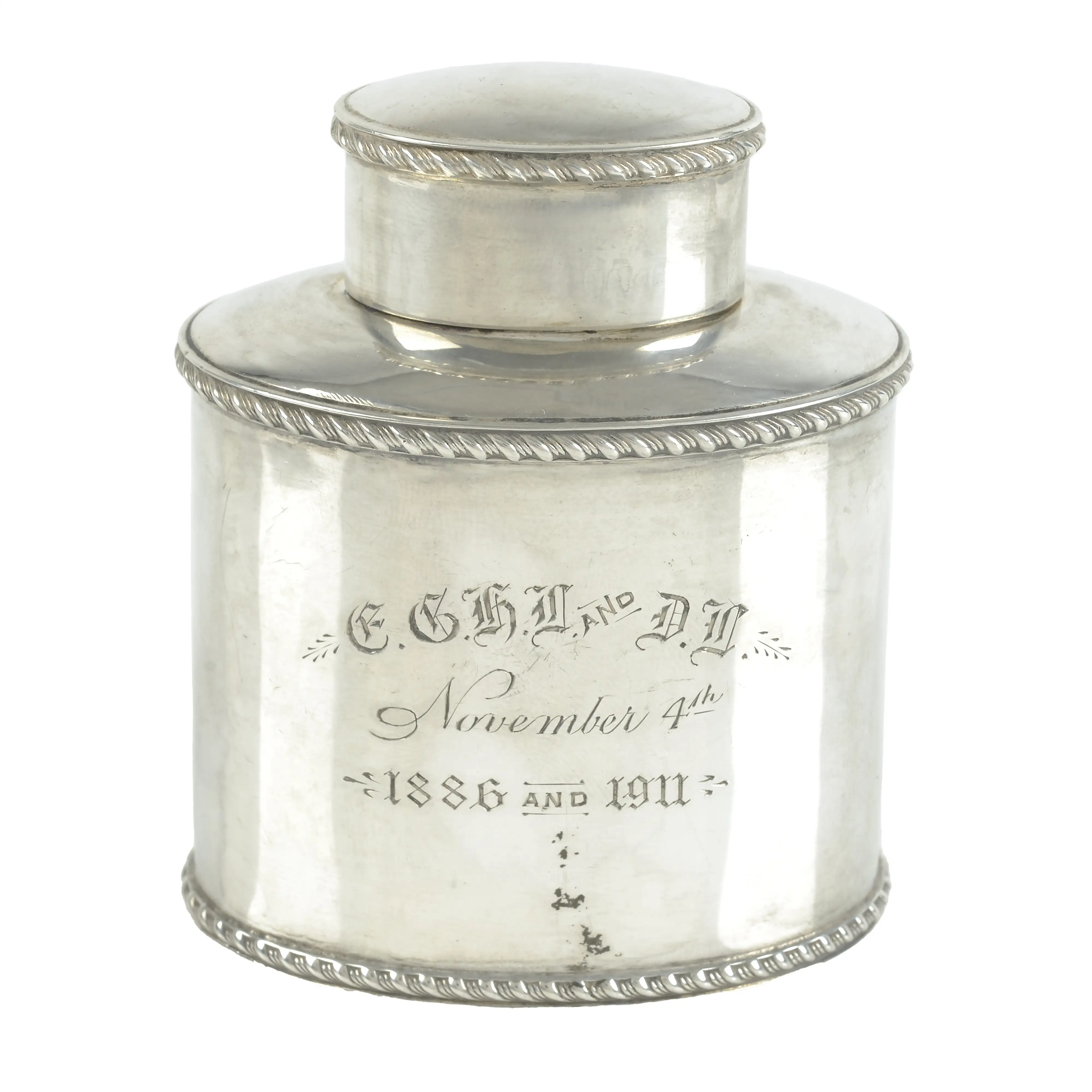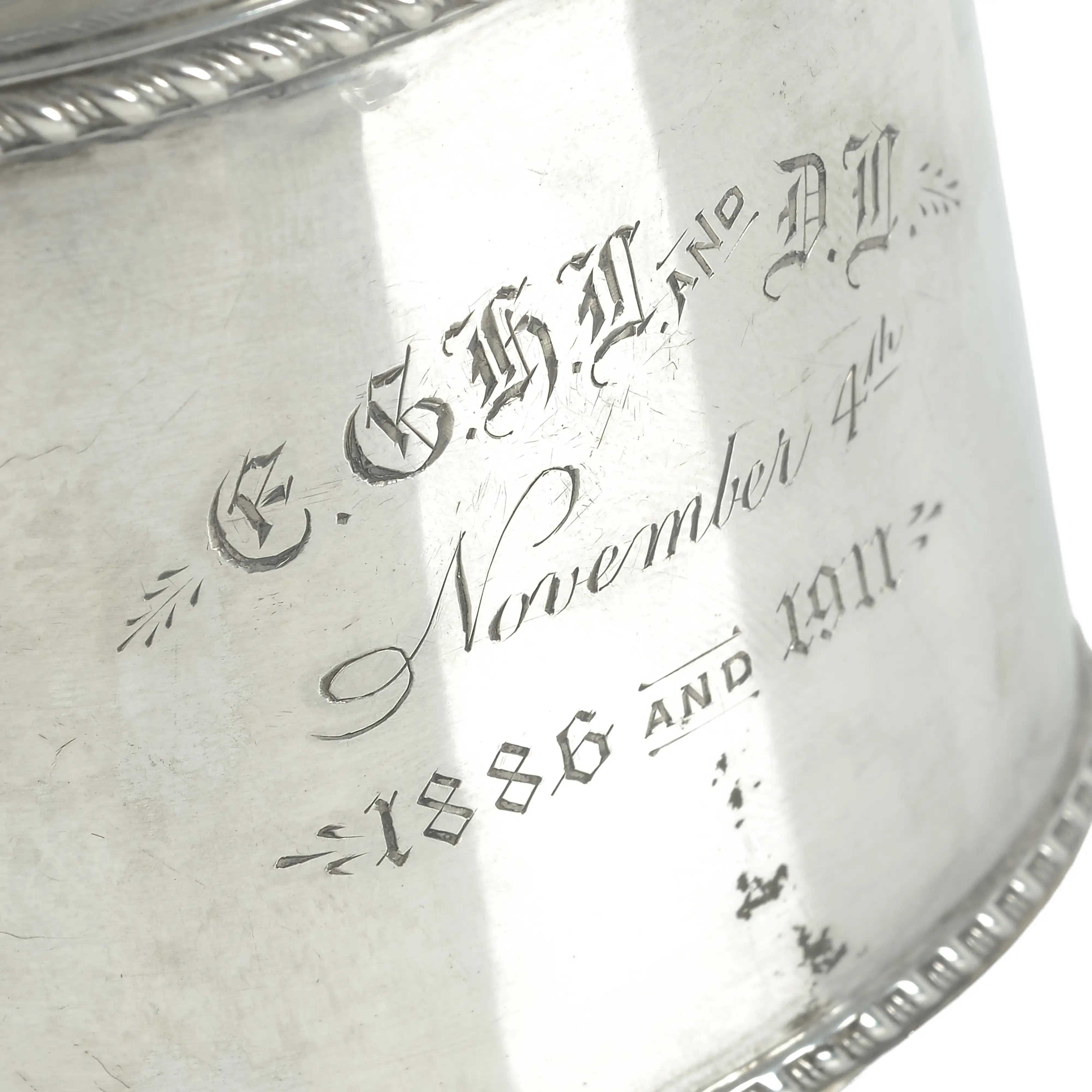 - Engraved with gothic initials over date 'November 4th 1886 and 1911'