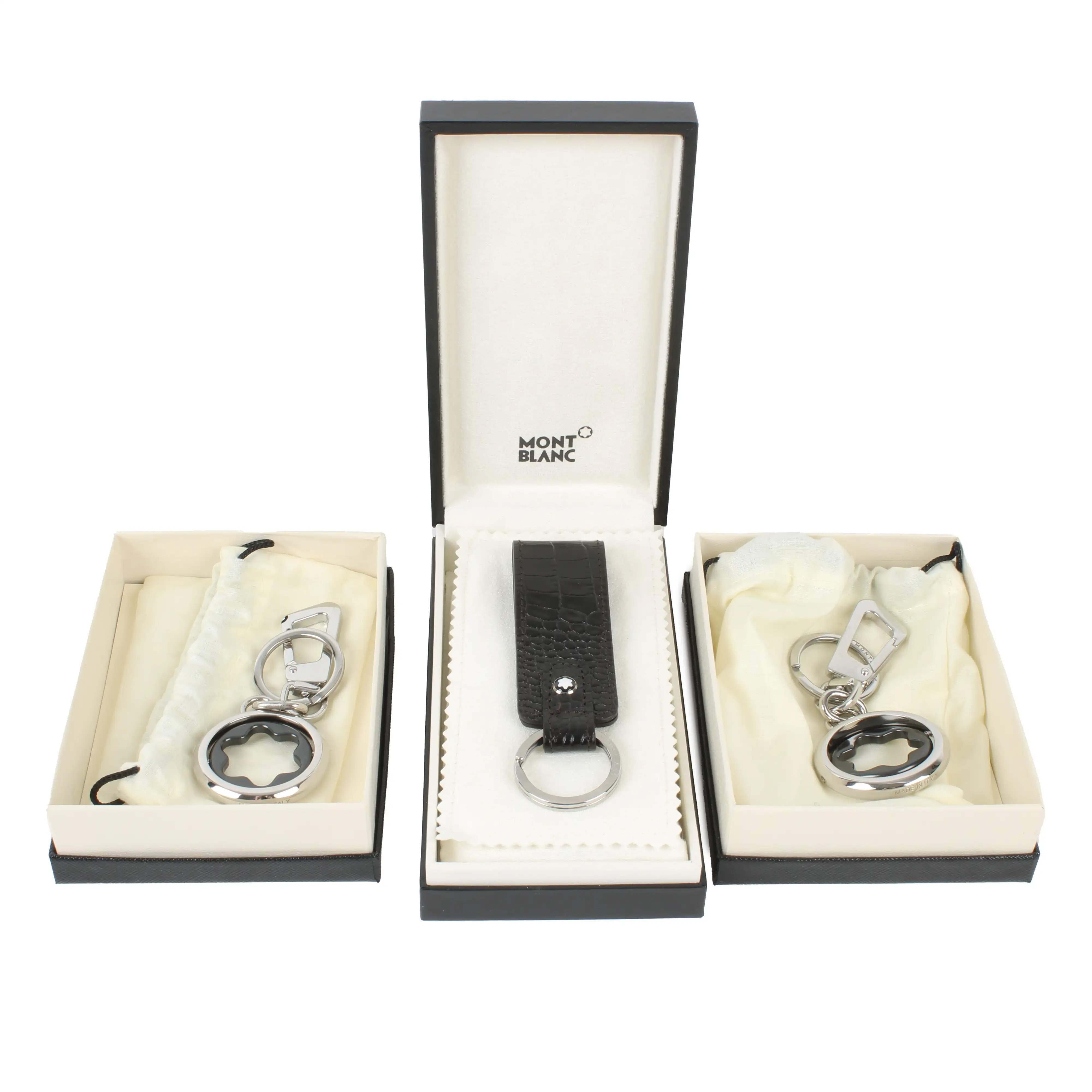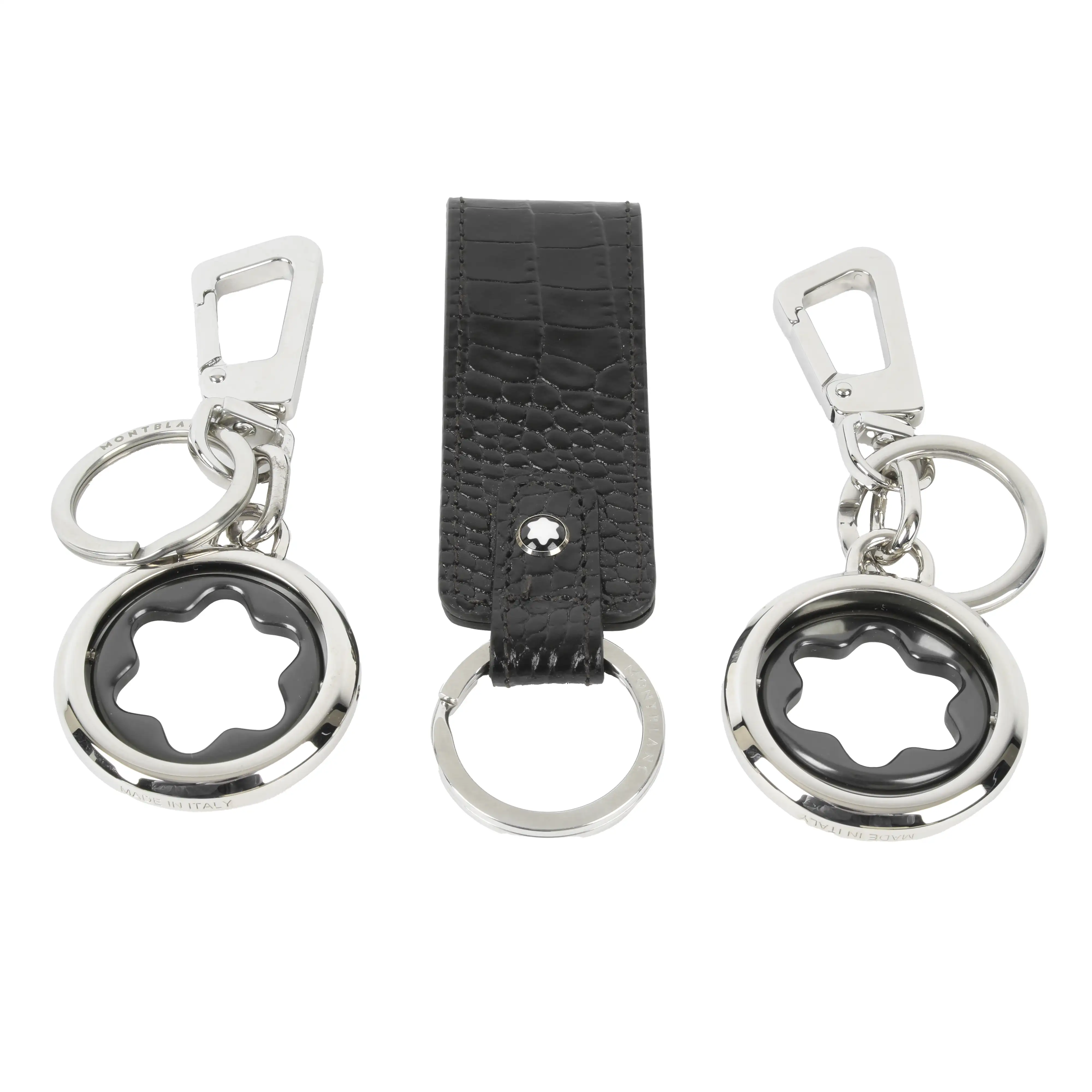 Three boxed Montblanc keyrings comprising two with spinning emblem and one with a leather strap (3)